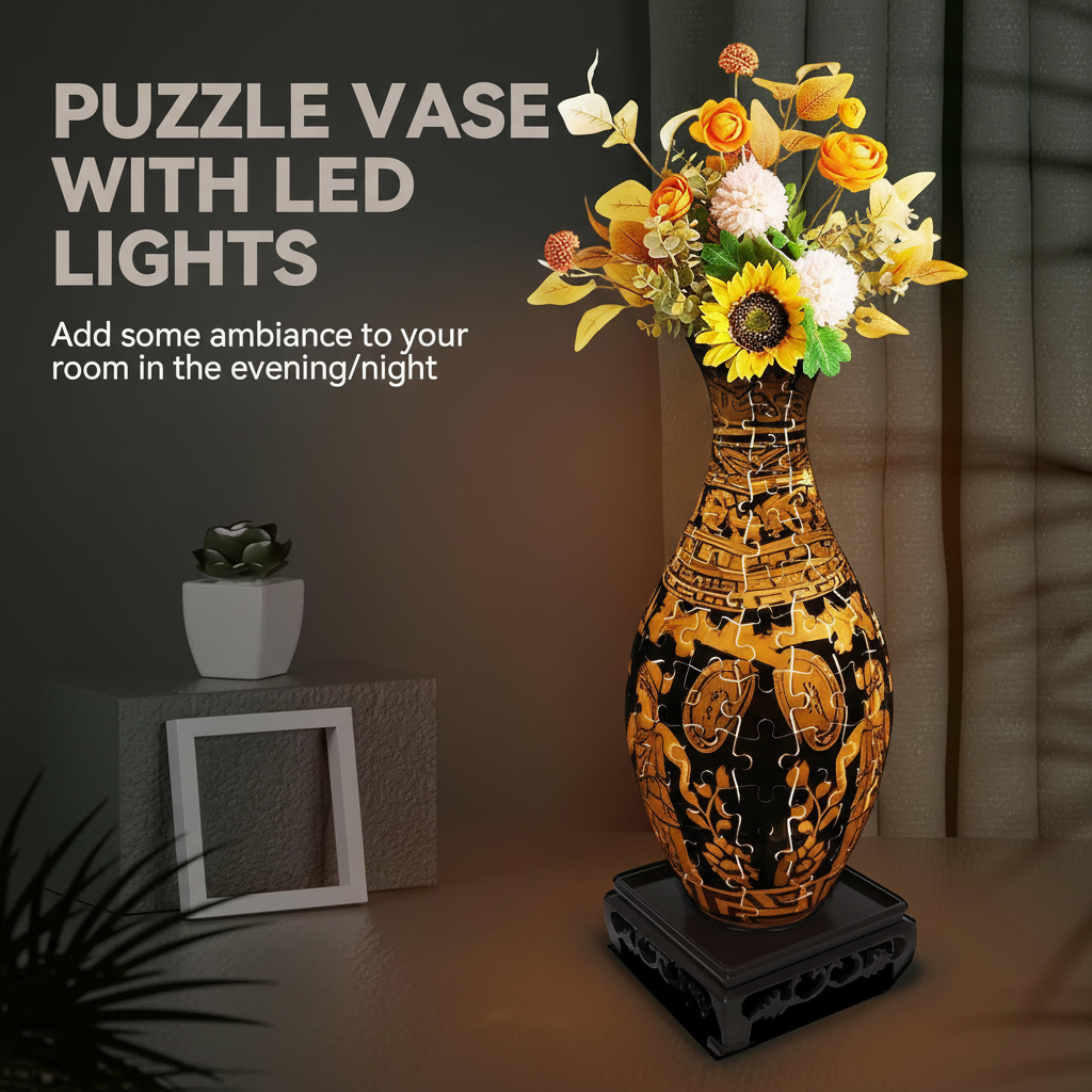 This 160 Piece 3D Puzzle Vase With LED Light For Flower Home Decor combines a creative activity with decorative style. Curved plastic puzzle pieces connect together to form a cylindrical vase with a detailed floral pattern. The design includes a built-in LED light that creates a glowing decorative effect during evening hours or in dim surroundings.