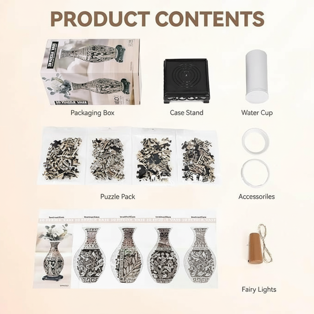 Once the puzzle pieces are assembled, the vase becomes a functional decorative container suitable for displaying fresh flowers, artificial flowers, or puzzle flower designs. The included removable water cup allows flowers to be placed safely while maintaining the decorative appearance of the puzzle structure.