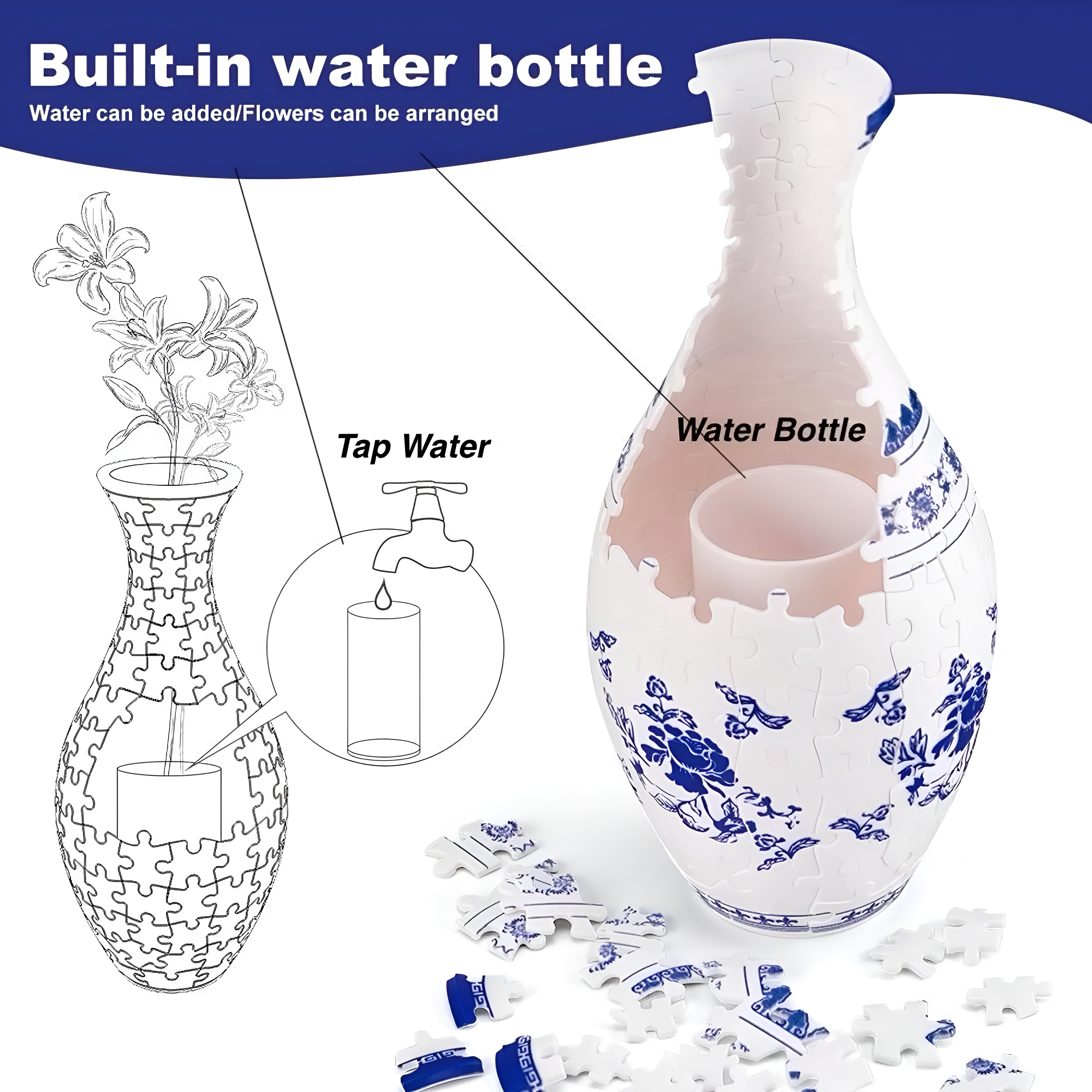 This transformation from puzzle to vase encourages continued use of the product rather than storage after completion. The detachable container allows repeated floral arrangement changes which keeps the object useful across different decorative styles.