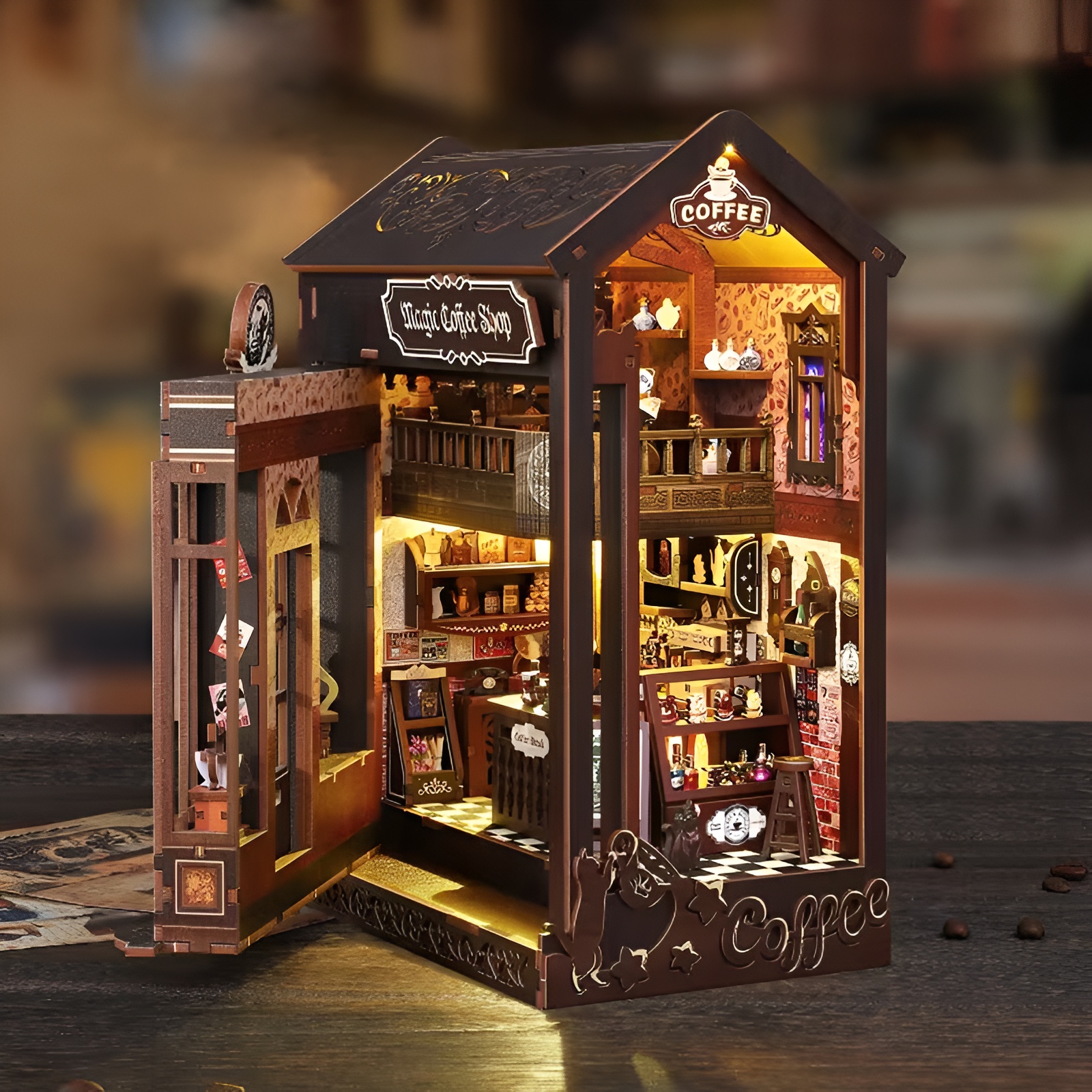 The intricate café design of this miniature model recreates the charm of a classic coffee shop through detailed decorative elements and carefully crafted puzzle components. Wooden pieces form shelves, counters, and architectural structures that create a realistic miniature café interior. The layered design adds depth and visual richness to the display, allowing the scene to be viewed from multiple angles. LED lighting gently illuminates the miniature environment, enhancing the warm café atmosphere and highlighting the decorative details inside the shop. Once assembled, the model becomes an elegant decorative piece that adds charm and creativity to bookshelves or hobby displays. The café theme transforms ordinary shelving spaces into miniature storytelling scenes inspired by coffee shop environments. This DIY model provides both an engaging building experience and a visually appealing decorative display suitable for collectors and miniature enthusiasts.