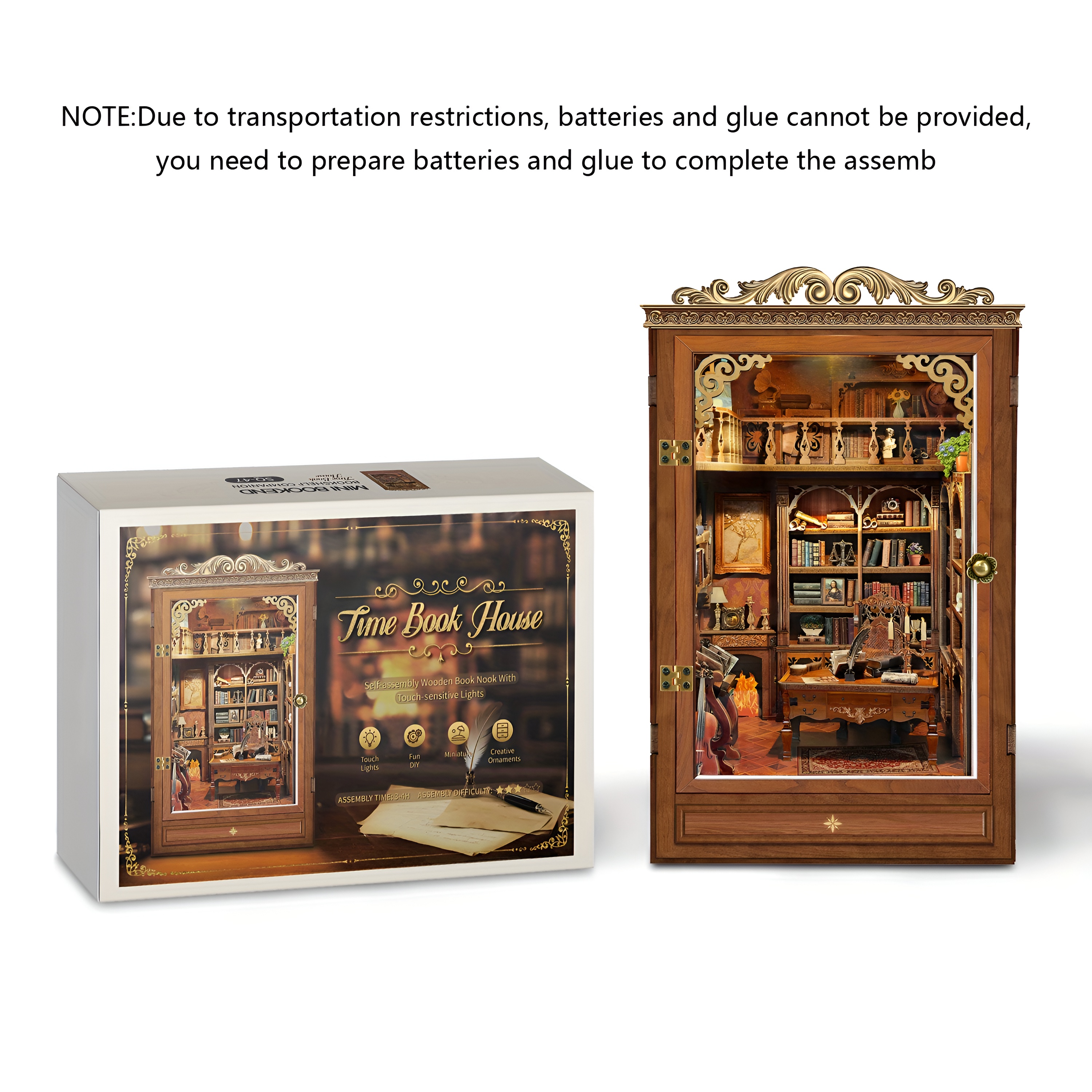 The intricate design of this miniature study room highlights artistic craftsmanship through detailed decorative elements and carefully crafted puzzle components. Wooden pieces form shelves, architectural frames, and miniature furniture that create a realistic library environment. The layered construction adds depth to the display, allowing the miniature scene to appear lively and immersive from multiple viewing angles. LED lighting gently illuminates the interior space, enhancing the warm reading room atmosphere and highlighting the decorative details inside the scene. Once assembled, the model becomes an elegant decorative piece that adds charm and creativity to bookshelves or hobby collections. The vintage theme transforms ordinary shelving into a miniature storytelling environment inspired by classic libraries and study rooms. This DIY model provides both an engaging assembly experience and a visually appealing decorative centerpiece suitable for miniature enthusiasts and collectors.
