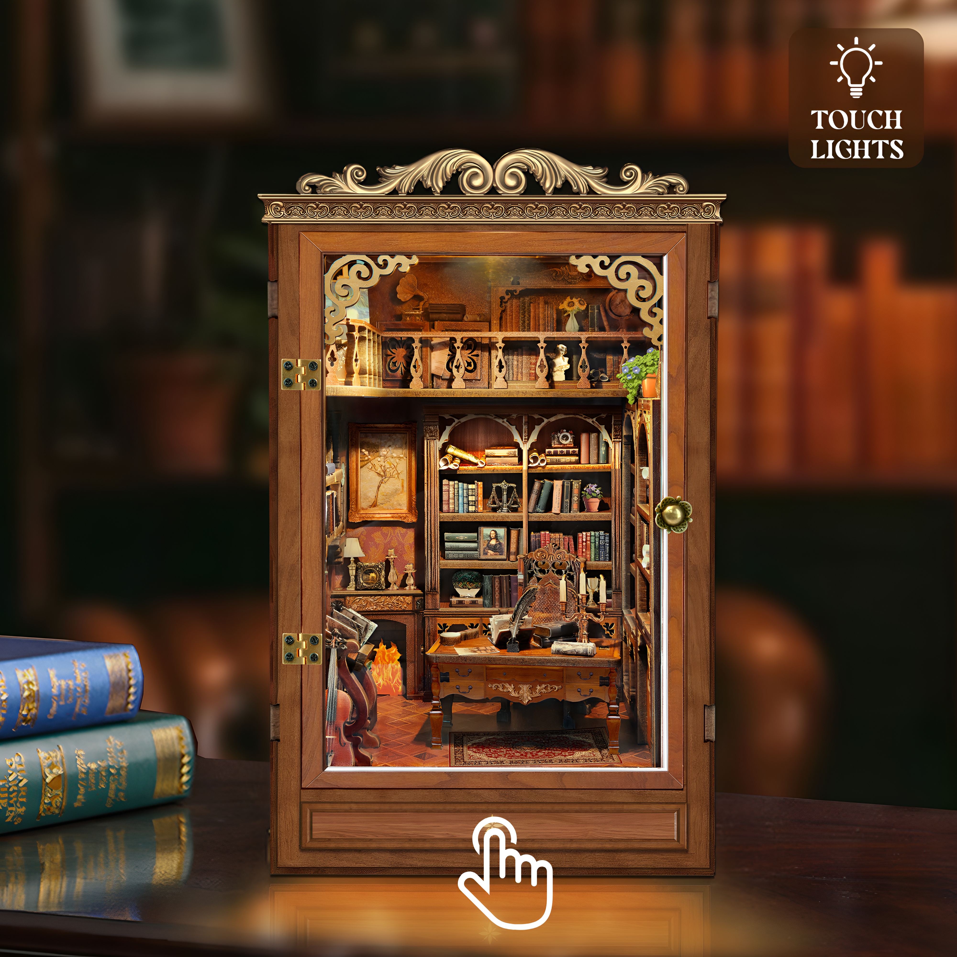 - Warm LED lighting enhances the cozy library atmosphere