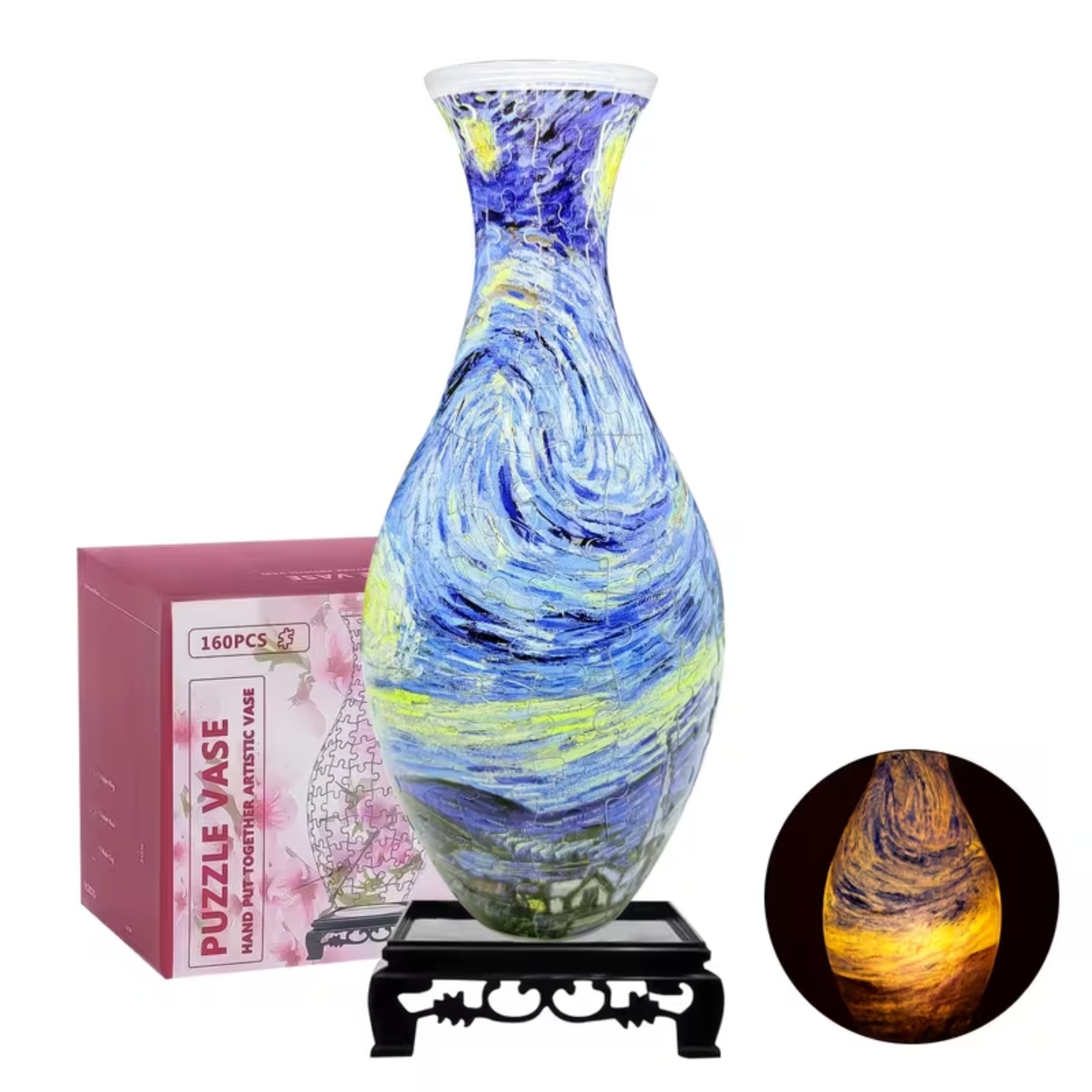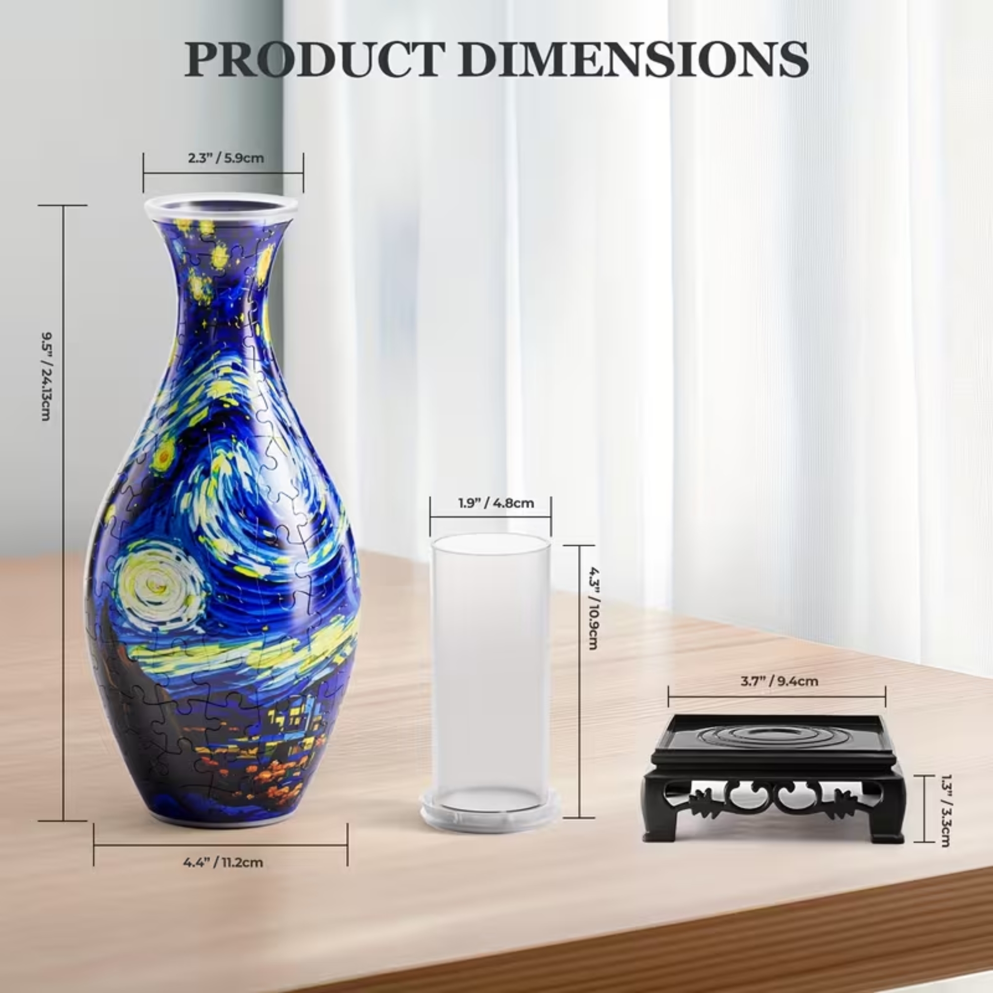 - The 3D Puzzle Decorative Vase is a puzzle assembly model designed to create a decorative vase using curved interlocking pieces. Through step by step construction, the puzzle components gradually form a tall vase structure decorated with a swirling night sky inspired pattern.