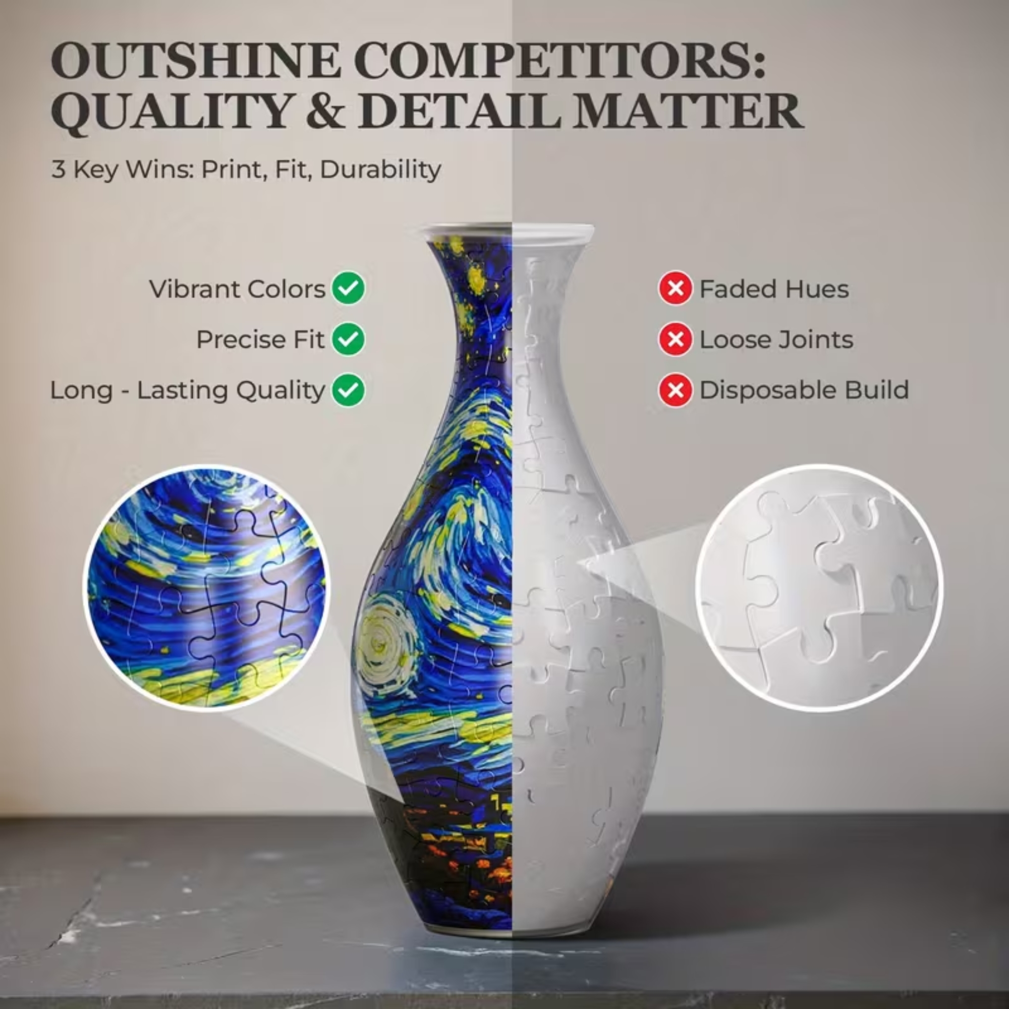 - Once assembled, the structure becomes a decorative display object suitable for desks, shelves, or interior decoration arrangements. With its puzzle based construction and detailed surface design, the 3D Puzzle Decorative Vase combines creative assembly with decorative display in a compact format.