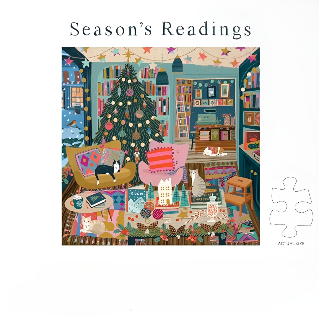 This 500 Piece Foil Jigsaw Puzzle Artwork For a Cozy Christmas Bookshop Scene presents a warm and inviting holiday scene filled with seasonal charm. The artwork features a festive shop with shelves of books, glowing lights, patterned textiles, and a decorated tree that creates a cheerful winter setting. Golden foil highlights add visual interest and give the completed image a good seasonal effect. At 500 pieces, the puzzle offers a balanced challenge suitable for steady progress without difficulty spikes. The final 20 x 20 inch layout becomes an appealing display for the winter season.