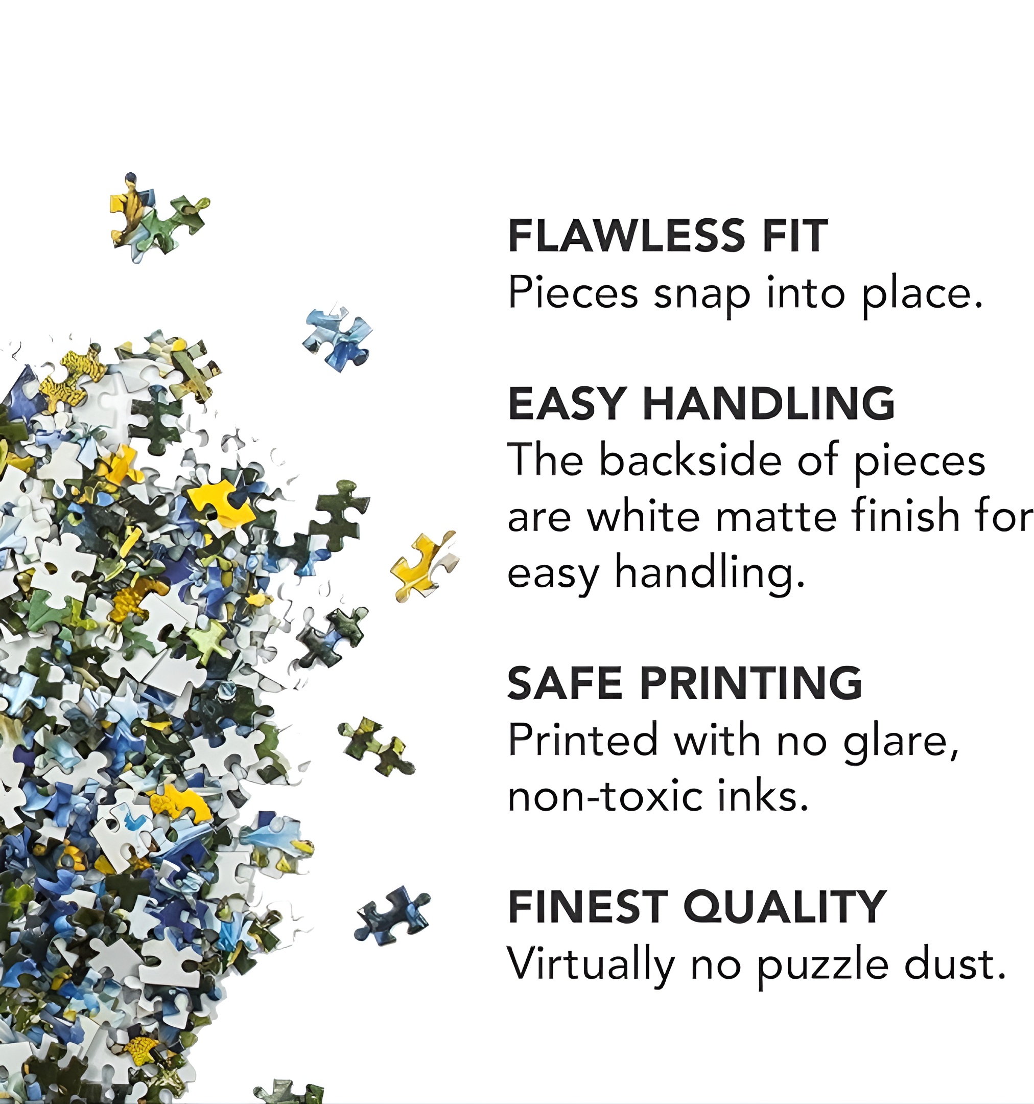 The puzzle is produced with a mindful approach to material selection. The greyboard contains 90 percent recycled paper and the packaging uses 70 percent recycled content. The materials come from sources that follow responsible production standards. Non-unsafe inks maintain clarity in the artwork while supporting safe printing practices. These choices create a puzzle that aligns with conscious manufacturing methods without compromising quality.