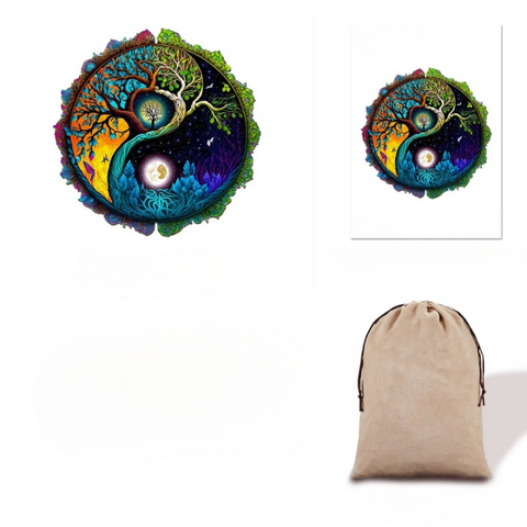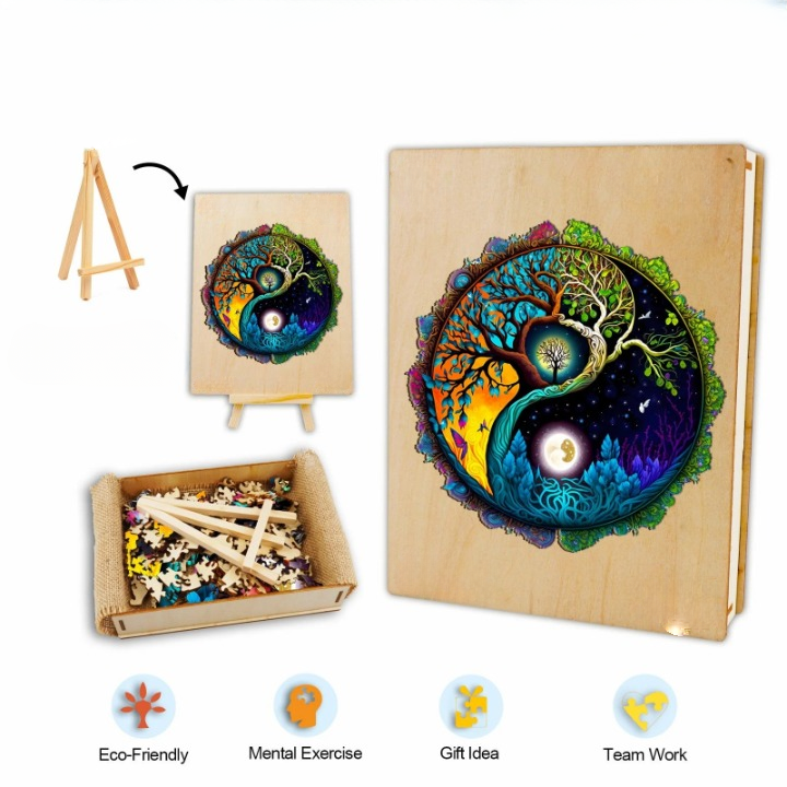The Abstract Wooden Art Puzzle is a stunning representation of nature's eternal cycle, depicted through a vivid contrast of day and night. This circular puzzle blends a myriad of flora and fauna into an intricate design. Unique shapes, including various animals and plants, add an extra layer of complexity and enjoyment!