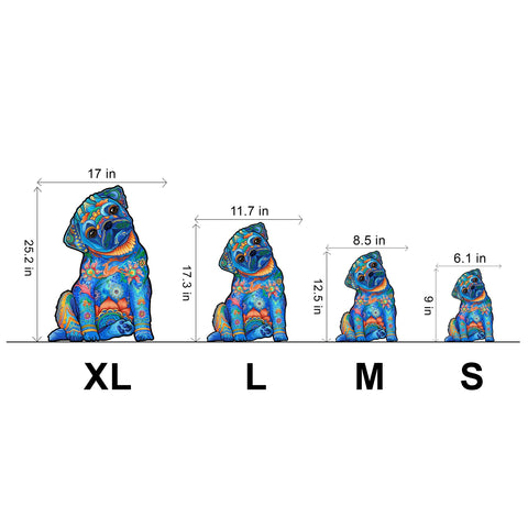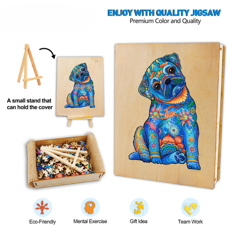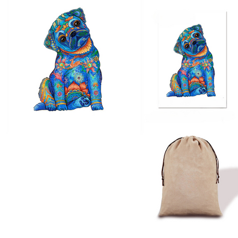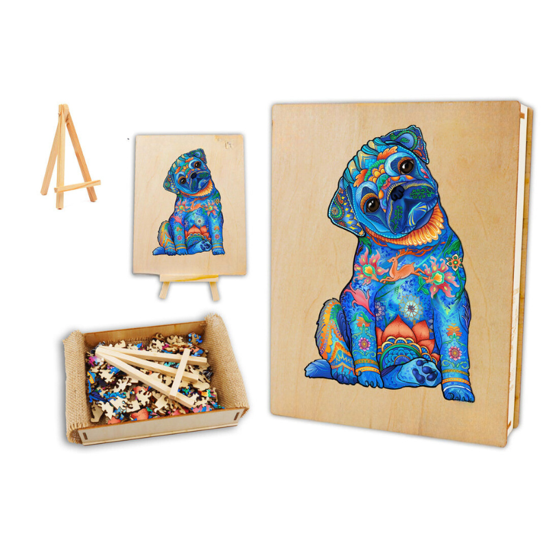 The image you have provided appears to be a vibrant, artistic wooden jigsaw puzzle of a pug. This Pug Wooden Jigsaw Puzzle appears to be not just a game but a gratifying work of art that provides both a decorative aspect and a rewarding activity for individuals or families to enjoy together. It showcases the following details: