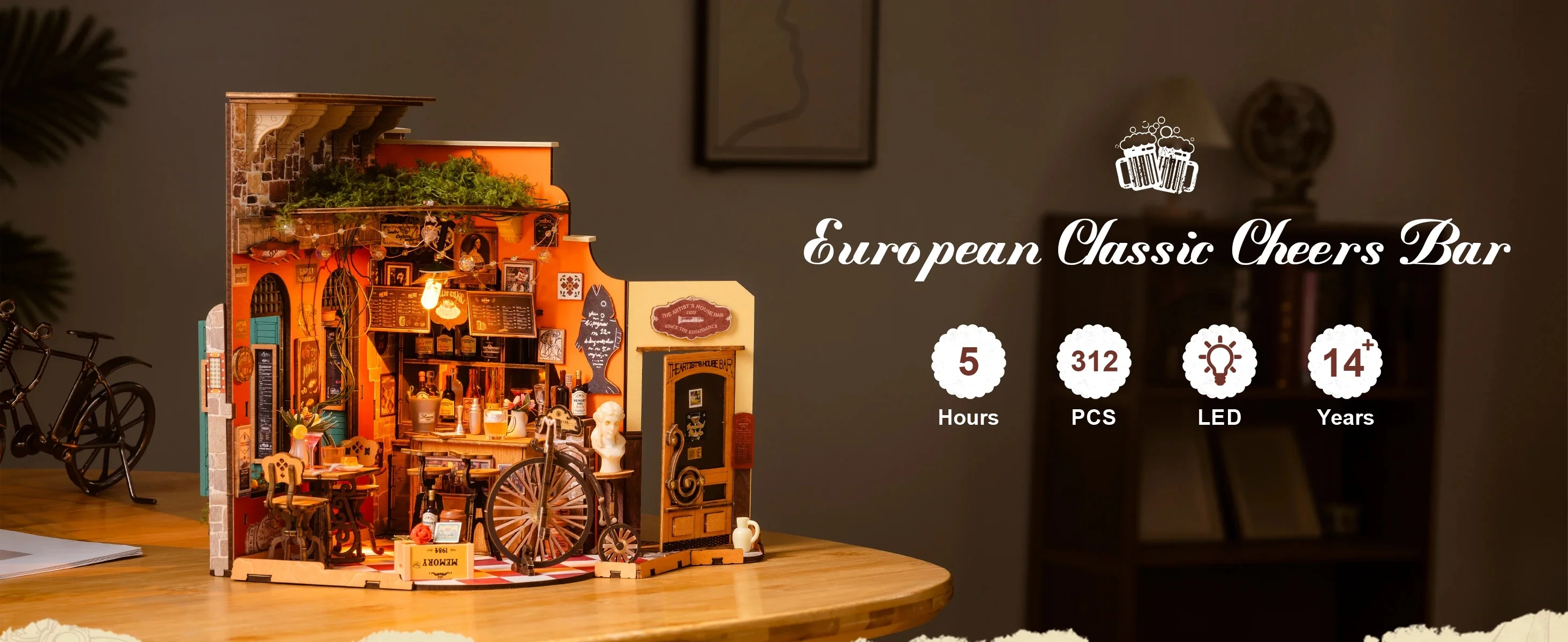 The finished layout fits neatly on a shelf or tabletop. Once built, it serves as a visual piece for collectors or anyone who appreciates detailed display environments. The included components replicate real-life bar furnishings in scaled-down form. Each piece has been precision-cut for assembly.