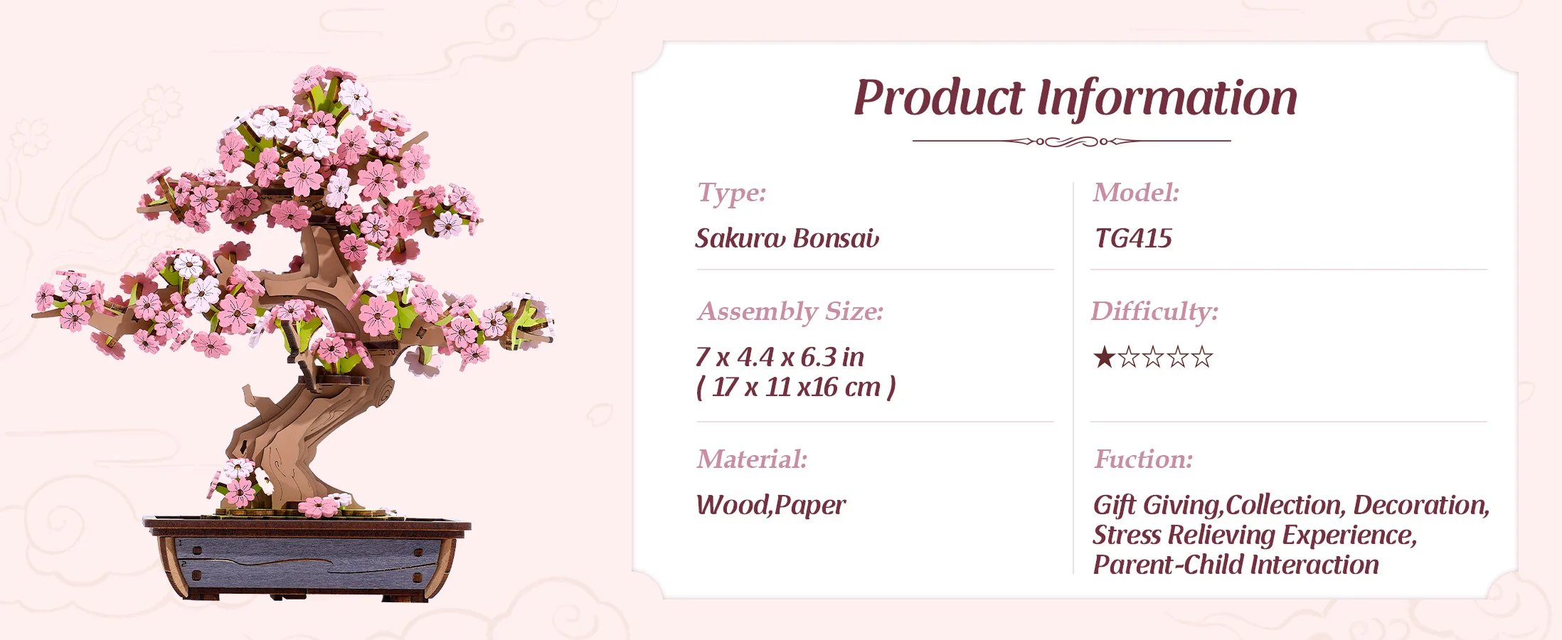 Specifications of Blooming Sakura Tree Wooden Bonsai 3D Puzzle Kit
