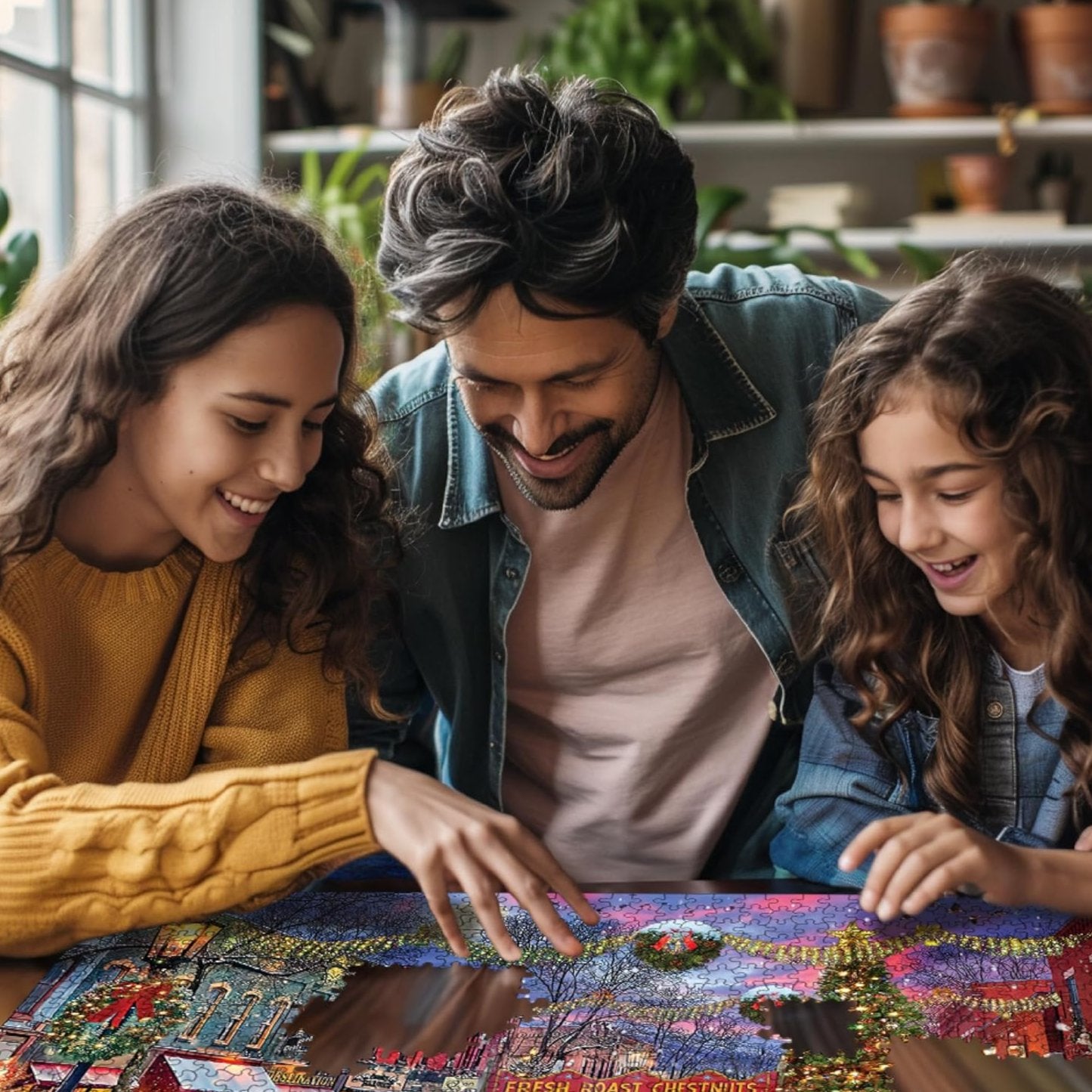 Immerse yourself in the holiday spirit with the Chestnuts Roasting Theme Christmas 1000 Pieces Jigsaw Puzzle, showcasing a snowy downtown scene filled with festive decorations, a charming chestnut stand, and cheerful holiday details. Measuring 24" x 30" when completed, this puzzle is an engaging activity for families to enjoy together. Crafted with precision-cut, interlocking pieces from recycled materials, it offers a seamless and satisfying assembly experience. The included bonus poster provides a helpful reference, making this puzzle a festive addition to your holiday traditions.