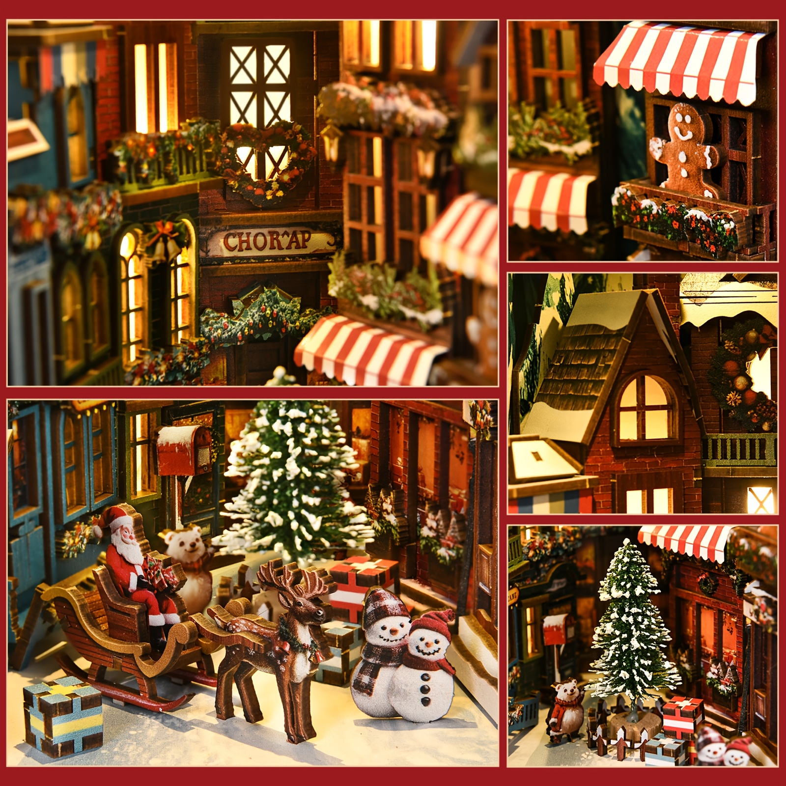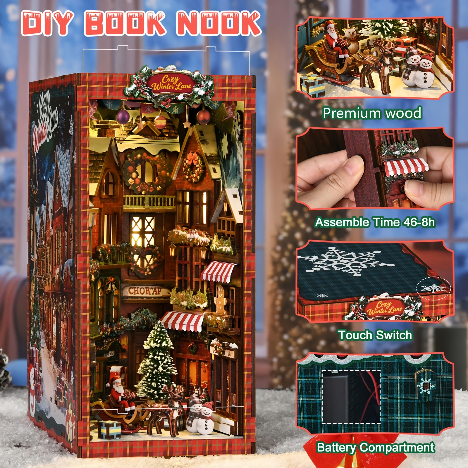 The Winter Village Book Nook is a DIY wooden puzzle kit designed to create a miniature winter village scene through step-by-step assembly. Wooden components gradually form houses, structural details, and a central street layout that together create a compact decorative environment.