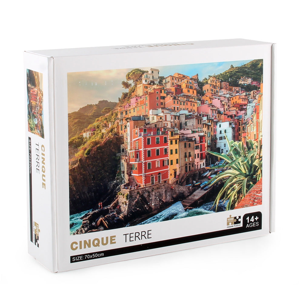 Cinque Terre Wooden 1000 Piece Jigsaw Puzzle Toy For Adults and Kids is a 1000 piece wooden jigsaw puzzle designed by artist Kiaan Scott. Enjoy this colorful centuries-old seaside villages while building piece by piece having an amazing puzzling time! The 1000-piece jigsaws offer an enjoyable challenge to all puzzle enthusiasts.