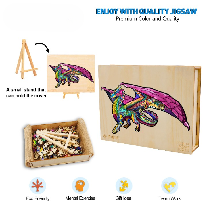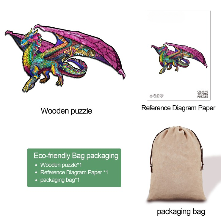 Embrace the fantasy realm with our Dragon Wooden Jigsaw Puzzle, where artistry meets play. This vibrant puzzle features a magnificent dragon with wings outstretched, with an array of colors and intricate patterns. Each wooden piece is carefully crafted to capture the fine details of the dragon's scales and feathers, offering an engaging challenge for puzzle enthusiasts and fantasy.