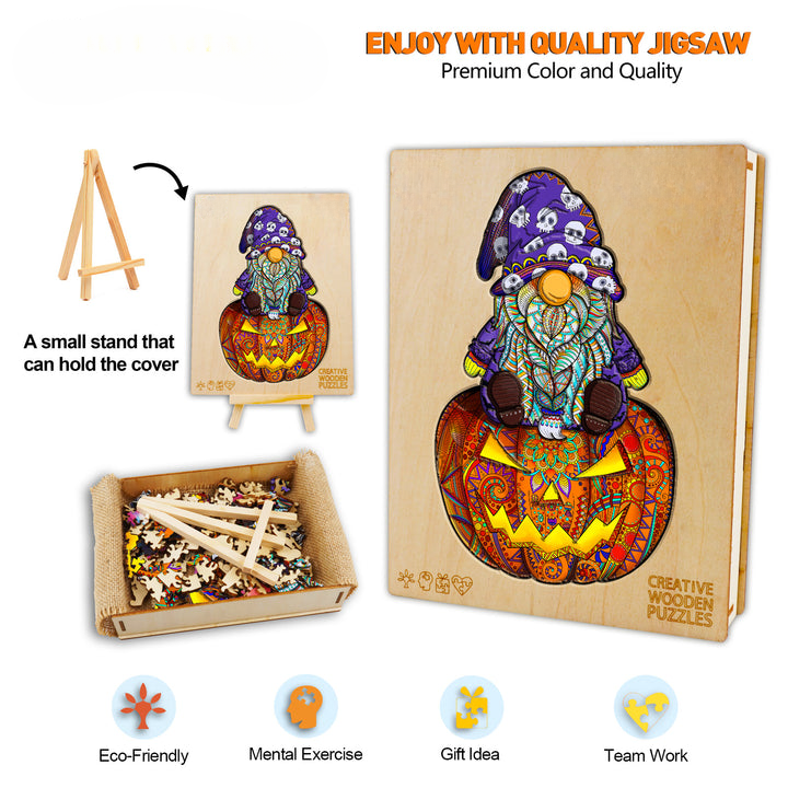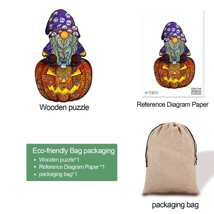 Summon the Halloween spirit with our Goblin Halloween Wooden Puzzle—a bewitching blend of enchantment and fun. Crafted with precision, this puzzle features a tiny wizard perched above a pumpkin. Ideal for Halloween festivities, elevate your celebrations with a bewitching activity that captures the magic of the season.