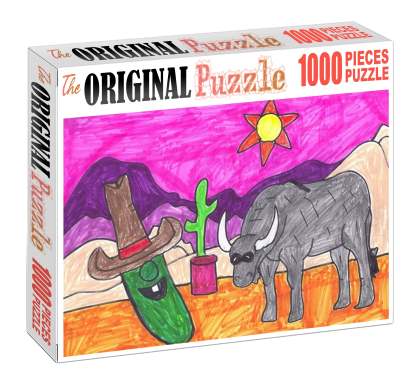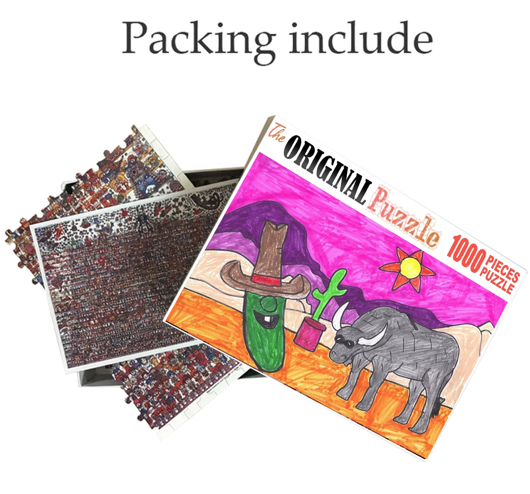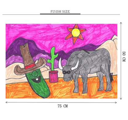 Cowboy Cucumber Drawing is a 1000 piece wooden jigsaw puzzle designed by artist Francis Deroa. The painting represents the imaginative idea of a dreamy castle in the clouds. This is a futuristic piece designed for little scientists in your house or older kids with a flair for space and fiction. The 1000-piece jigsaws offer an enjoyable challenge to all puzzle enthusiasts