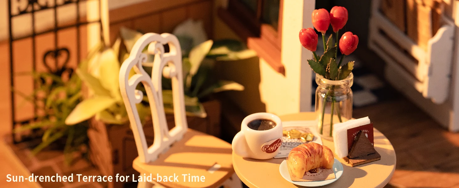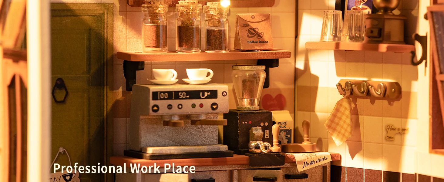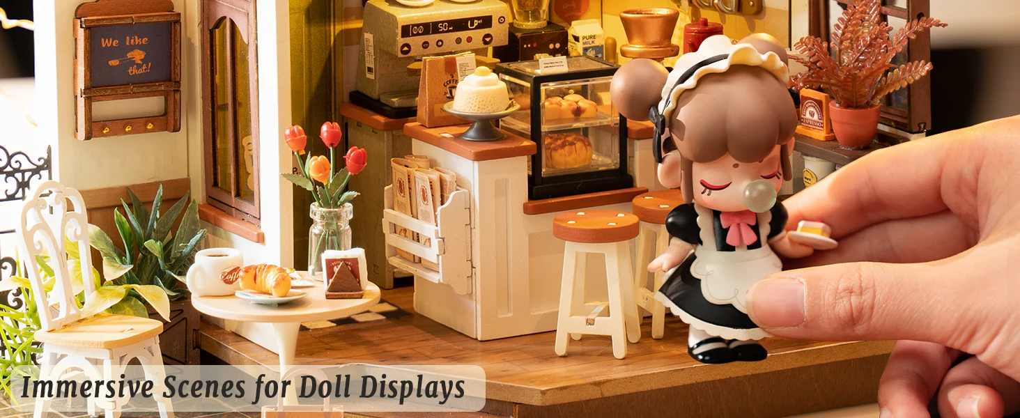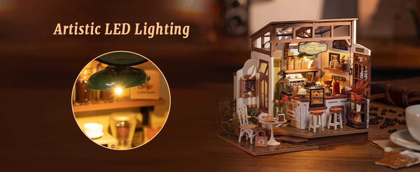 Unlike standard décor, this DIY miniature house kit invites you to build, design, and light up your own artistic space. The inclusion of LED lights adds warmth, transforming the miniature into a lifelike display that captures the comforting glow of a real café.