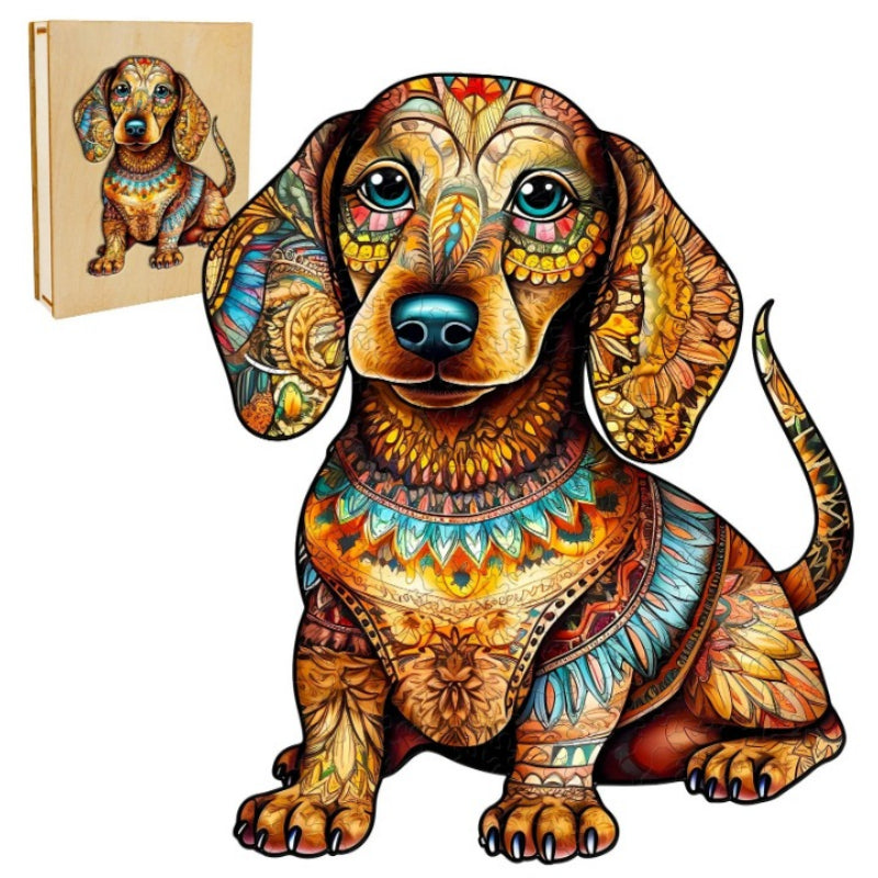 The Dachshund Puzzle Art is an artful ode to one of the most endearing dog breeds. This puzzle captures the playful spirit of a Dachshund, intricately adorned with rich, ornate patterns. With special pieces shaped like tiny bones and paws, this puzzle is perfect for dog fanatics, providing both a satisfying challenge and a beautiful tribute to these charming canines!