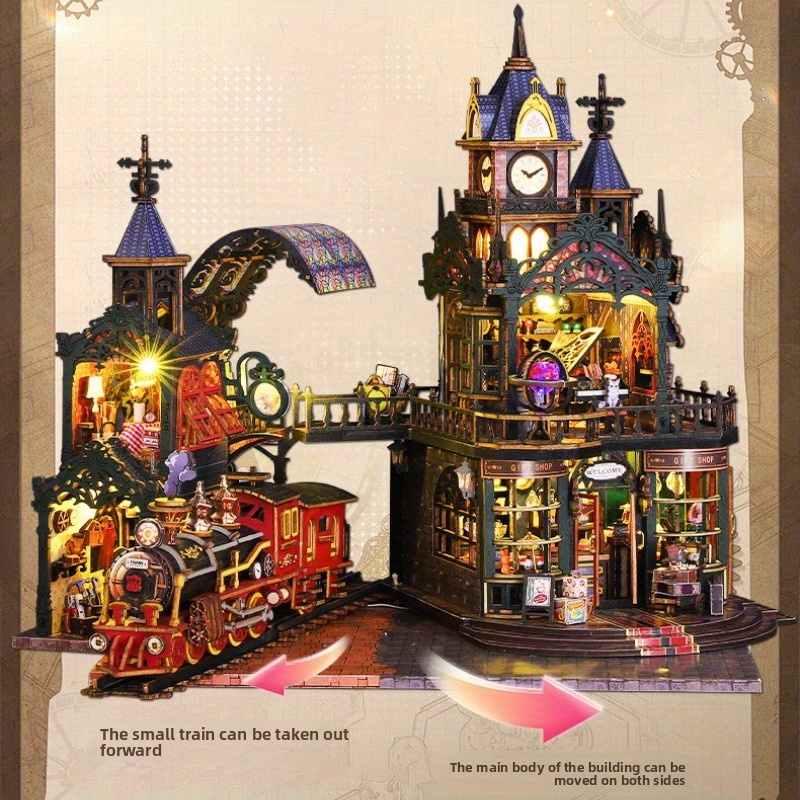 This miniature architectural model recreates the atmosphere of a mysterious city in a beautifully detailed display. Wooden components form towers, decorative buildings, and intricate city elements that bring the miniature scene to life. During assembly, each piece contributes to the creation of a multi-layered architectural environment filled with detailed miniature structures and artistic accents. The lighting feature highlights the intricate elements and enhances the dramatic city atmosphere when placed between books or on shelves. Once completed, the model becomes a captivating decorative display that adds character and visual depth to interior spaces. Its compact design allows it to integrate naturally into bookshelf arrangements while transforming ordinary shelves into imaginative miniature environments. This DIY project combines craftsmanship, creativity, and architectural design to produce a visually display suitable for hobby collections and decorative interiors.