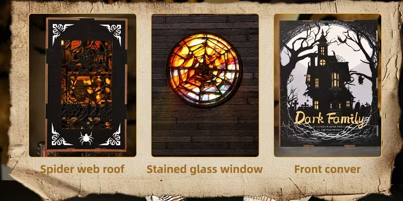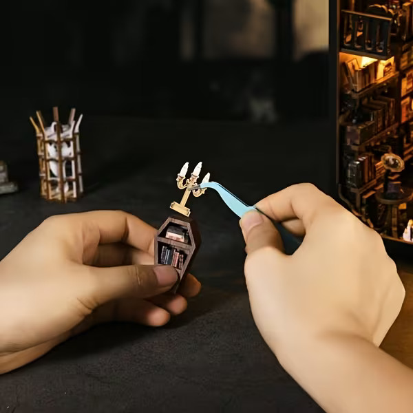 The Dark Mansion Library Book Nook is a DIY wooden puzzle kit designed to form a miniature mansion library scene that fits neatly between books on a shelf. Through step-by-step assembly, fiberboard components create both the outer book-style structure and the detailed interior environment.