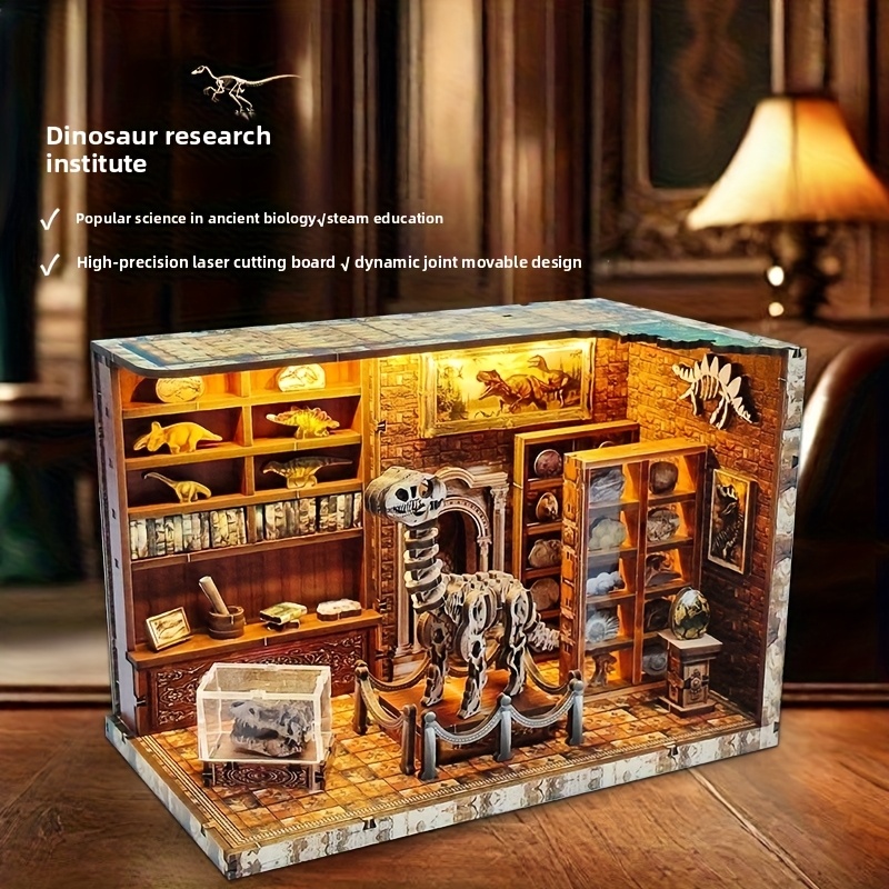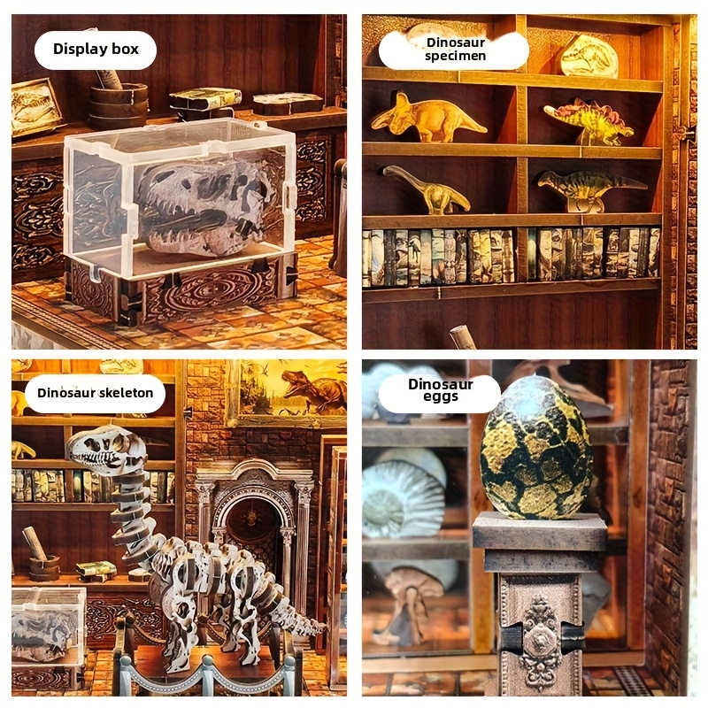 The Dinosaur Museum Library Book Nook is a DIY puzzle assembly kit designed to create a miniature museum themed interior that fits between books on a shelf. Through step by step construction, the components gradually form exhibit areas, shelves, and decorative structures that represent a museum display environment.