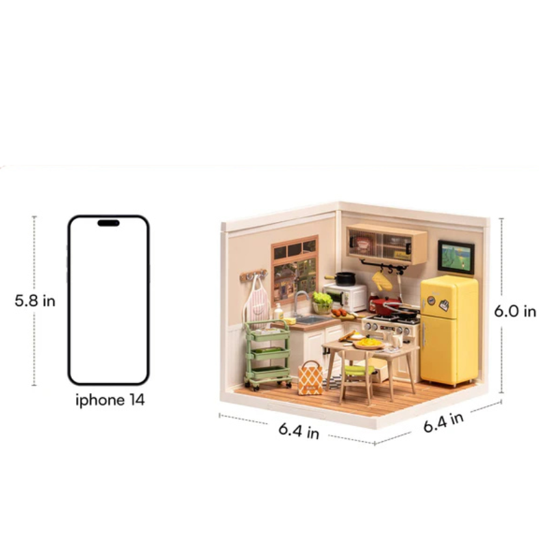 Bring the atmosphere of a cozy cooking space into your miniature world with this DIY Kitchen Room Puzzle Kit With Dining Area And Stove Setup. Designed for hands-on creation, this assembly model allows you to build a kitchen-themed room with table seating and stove placement. Each component contributes to a layered scene that reflects a daily indoor routine in a quiet moment.