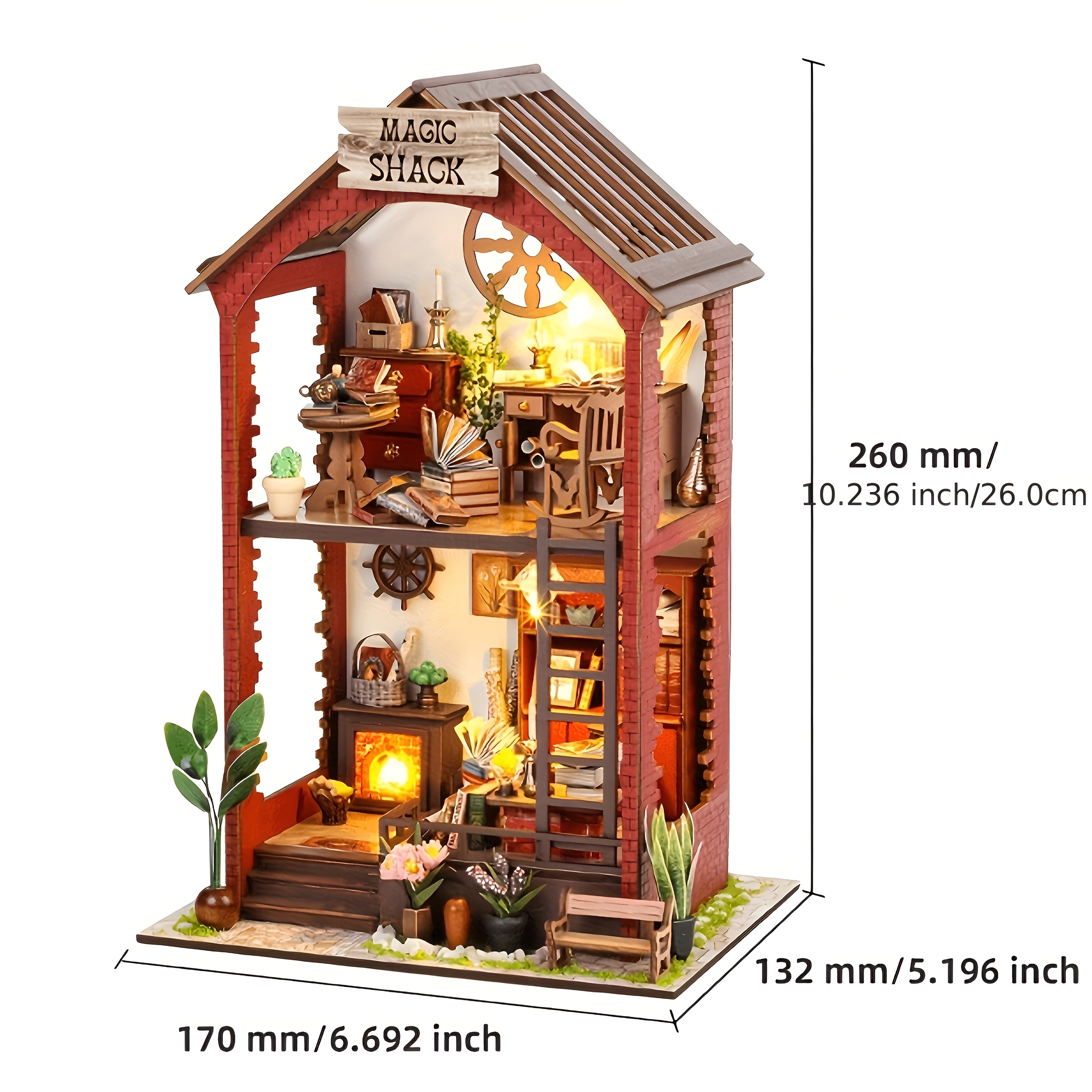 The Magic Shack Book Nook is a DIY wooden puzzle kit designed to create a miniature two level house scene that fits between books on a shelf. Through step by step assembly, wooden components gradually form the house structure, interior furniture layout, and decorative elements.