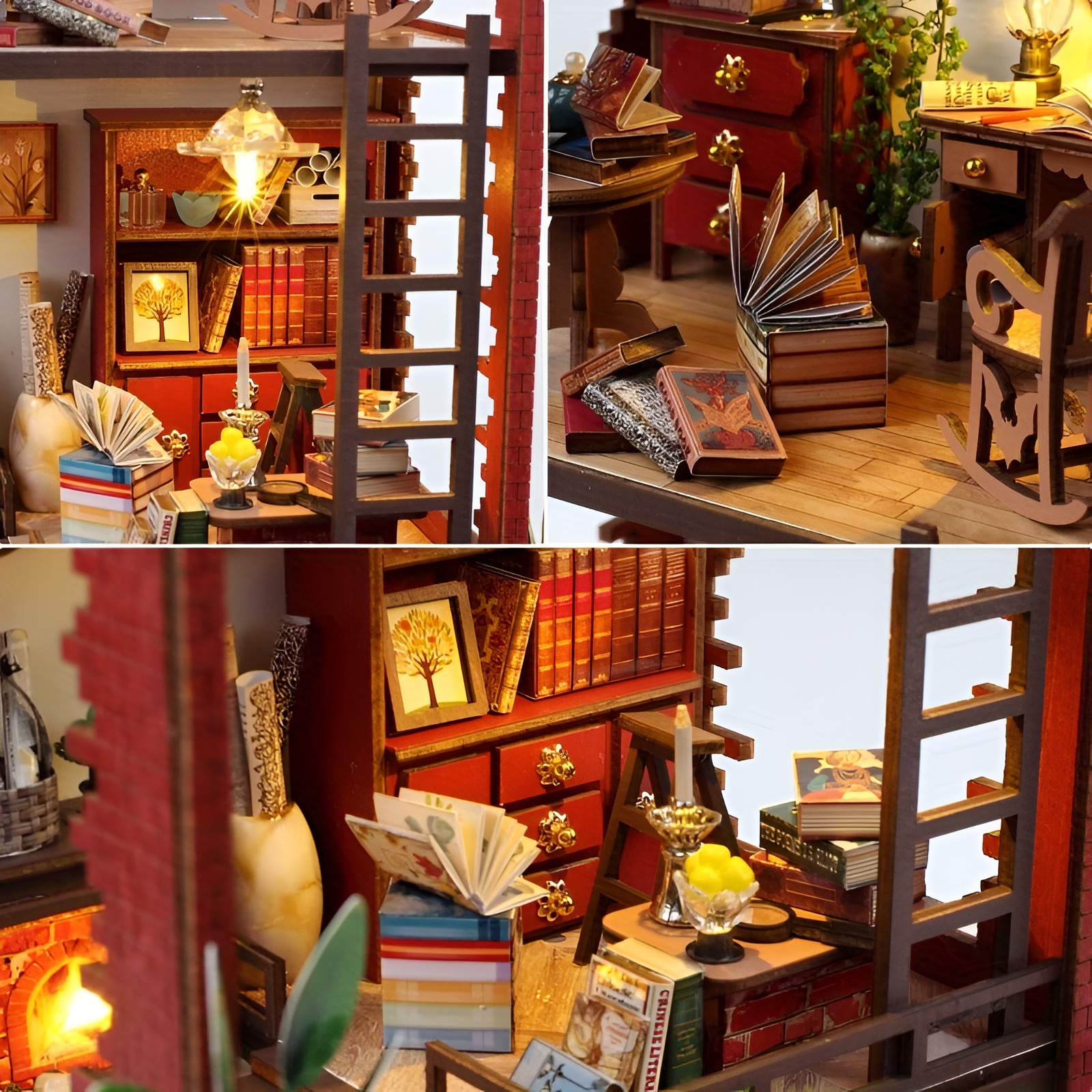 The miniature house scene adds visual detail within shelf arrangements.