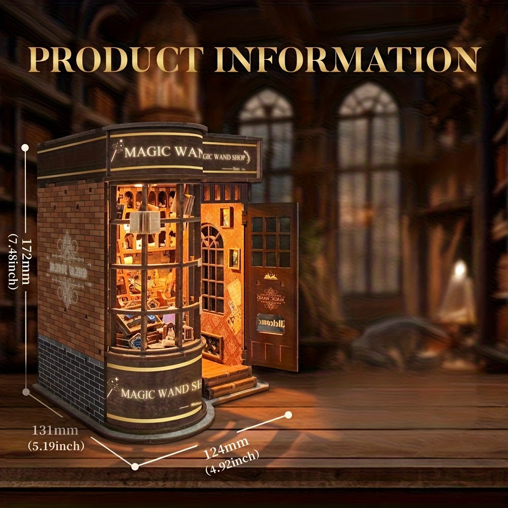 - Magic Wand Shop Book Nook features a detailed wizard shop miniature scene
