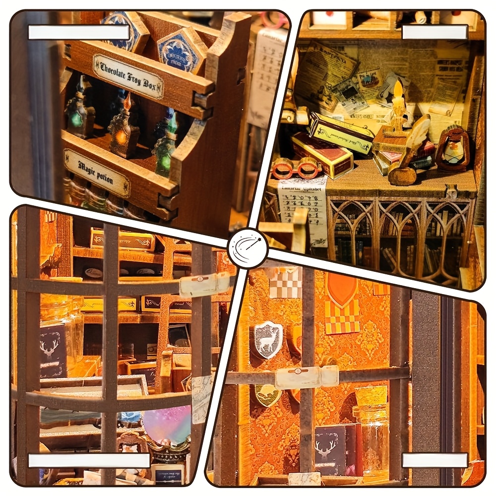 The intricate design of this miniature wizard shop highlights artistic craftsmanship through carefully crafted wooden puzzle components and decorative details. Shelves, counters, and architectural frames create a realistic shop environment filled with magical character. The layered structure adds depth to the scene, allowing viewers to explore the miniature shop from different angles. LED lighting softly illuminates the interior, creating a warm glow that enhances the magical shop atmosphere. Once assembled, the model becomes a decorative piece that adds creativity and personality to bookshelves, desks, or display collections. The theme transforms ordinary shelving into a miniature storytelling environment inspired by magical worlds and mysterious shops. This DIY building experience offers both an engaging crafting activity and a visually decorative display suitable for miniature collectors, enthusiasts, and creative hobbyists.