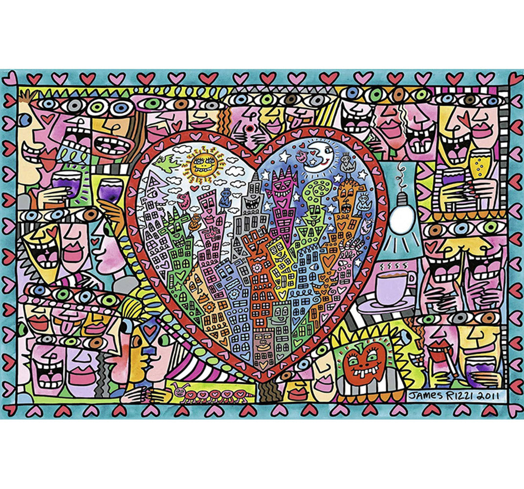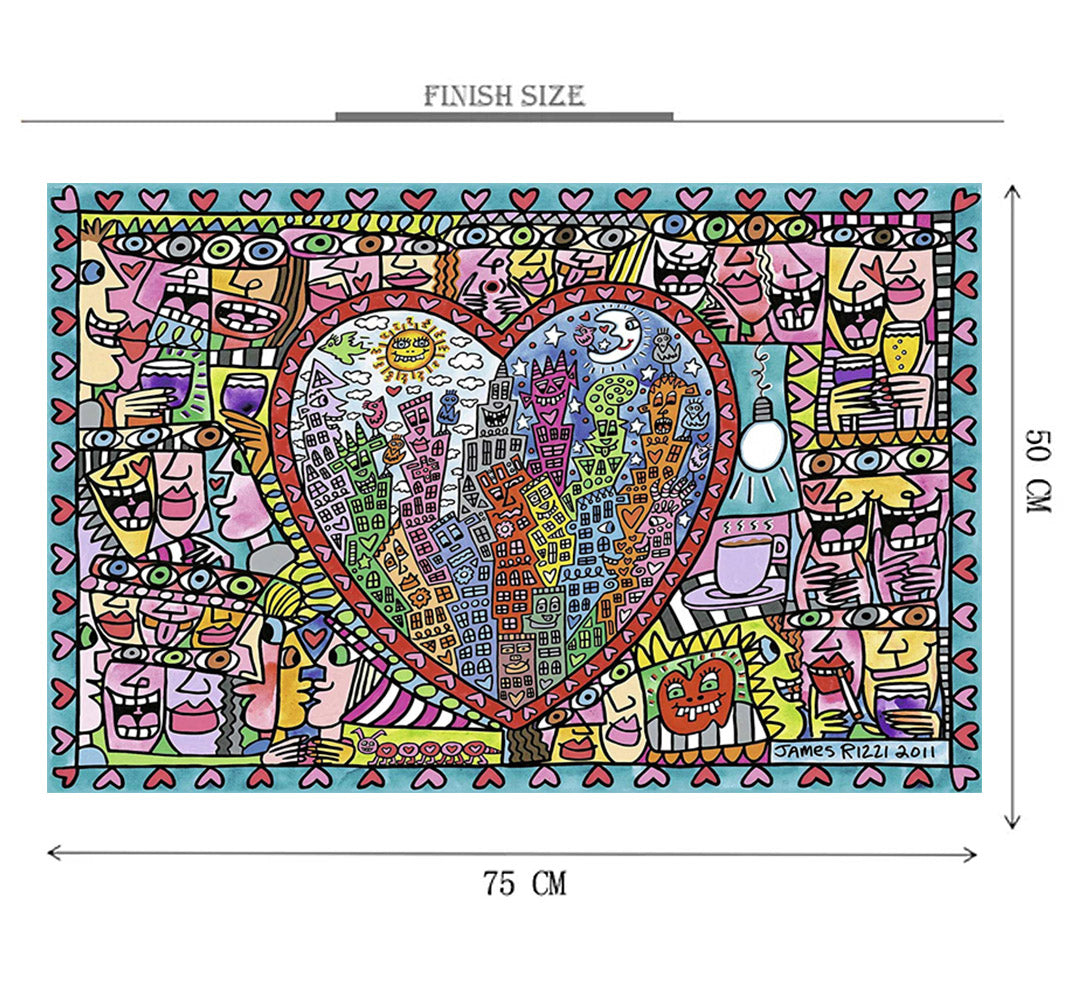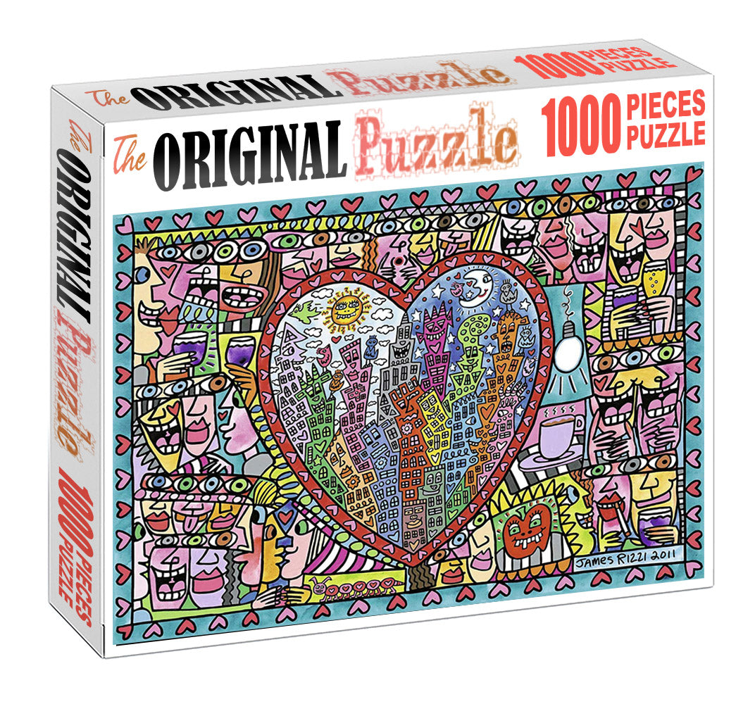 Heart of Smiles is a 1000 piece wooden jigsaw puzzle that features a cartoon abstract illustration of a heart made of abstract drawings.