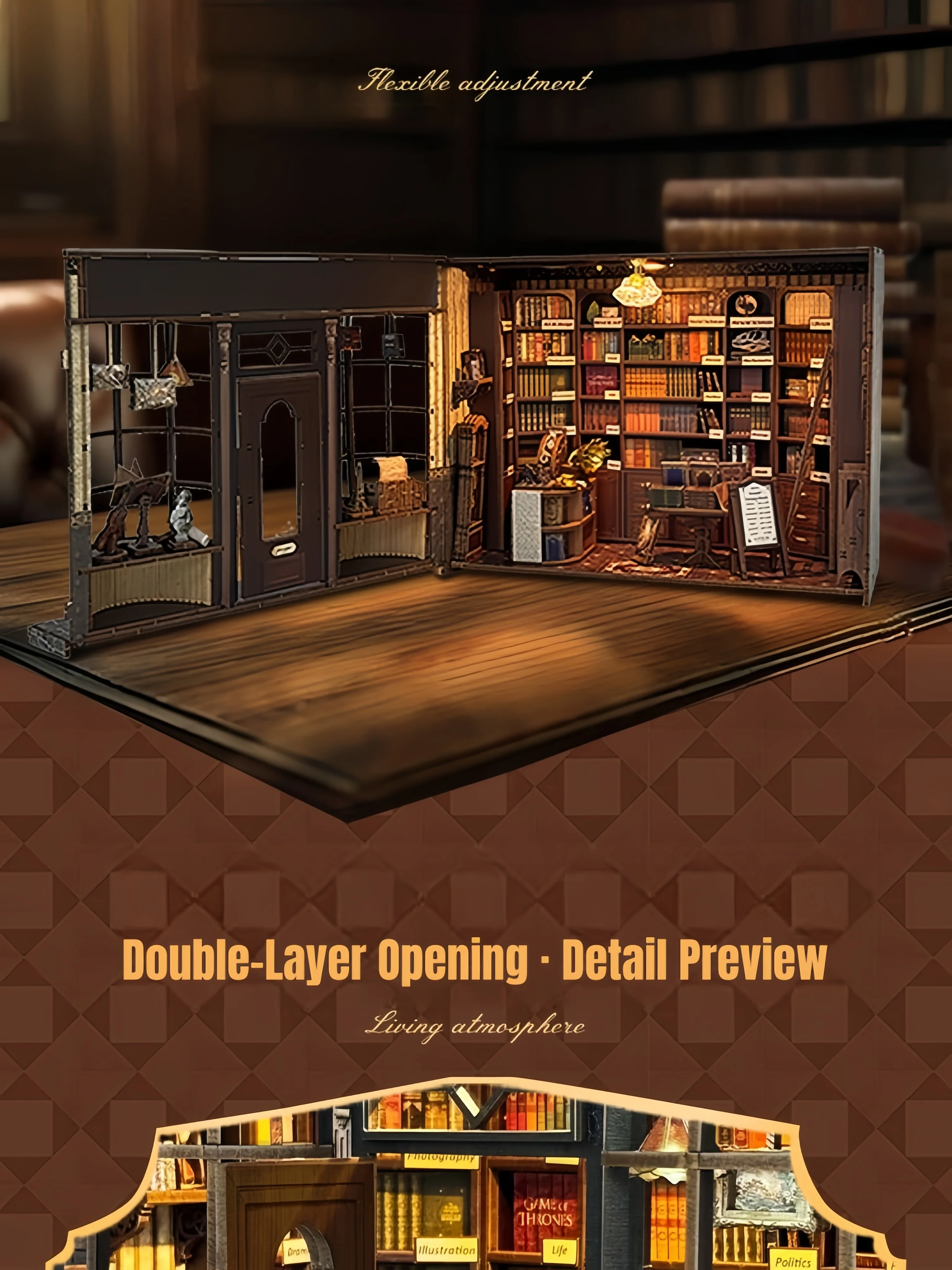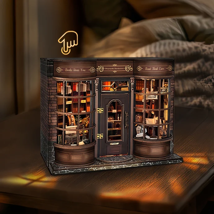 The Hoggor Bookstore DIY Book Nook Kit pays homage to the golden age of bookstores. Its façade features intricate windows, signage, and textures that echo the sophistication of early 20th-century design. Inside, the multi-level layout reveals wooden stairs, bookshelves, and lamps—each element handcrafted with care.