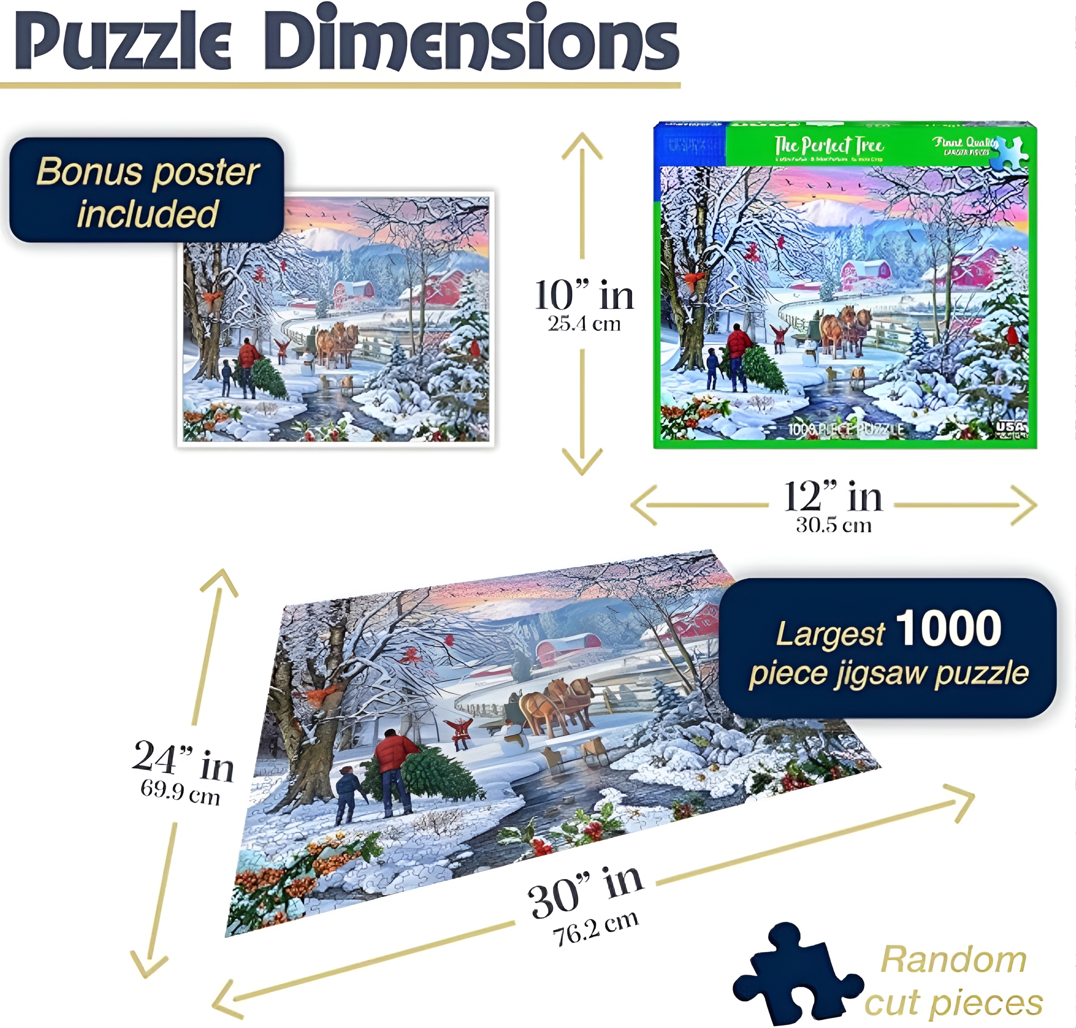 The Holiday Winter Farm Landscape Puzzle Set features a detailed seasonal landscape presented across one thousand interlocking pieces. The artwork depicts a winter farm setting with barns, pathways, animals, and snow-covered surroundings arranged in a balanced layout. This puzzle is designed for adults and teens who enjoy steady assembly projects that progress through pattern recognition and visual organization. The finished image measures approximately 24 × 30 inches, making it suitable for tabletop display or framing after assembly.