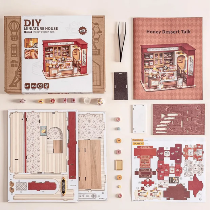 Assembly requires time and patience, offering an activity suited for focused crafting. Building the Honey Dessert Talk DIY Miniature House encourages patience and focus. Each step in the instruction booklet guides the user through careful assembly, from structural walls to final decorative elements.