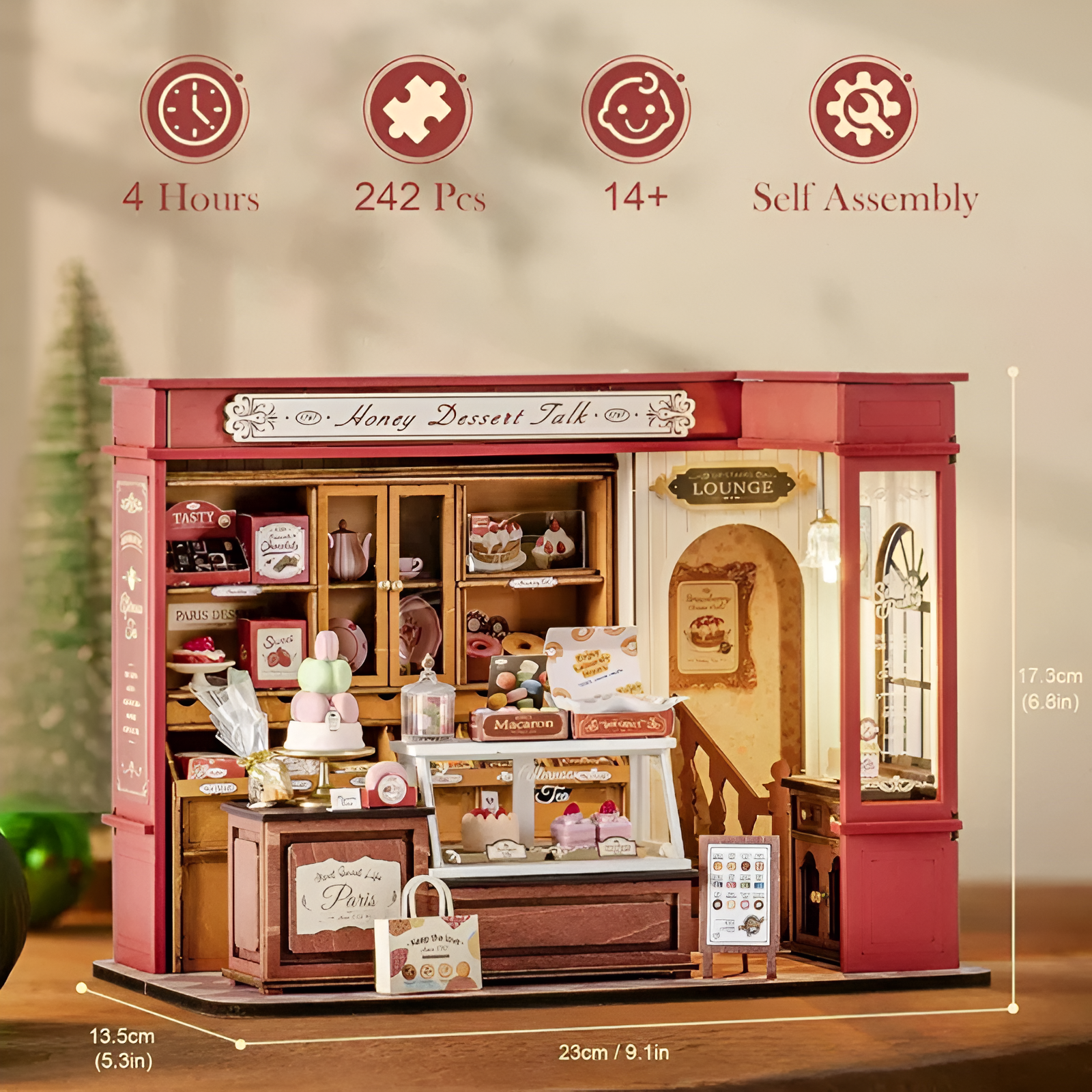 Create an immersive display with the Honey Dessert Talk Themed DIY Miniature House Craft kit, a tabletop construction project themed around a warm-toned dessert shop. This hands-on kit invites creative minds to bring to life a detailed room scene inspired by confection counters and afternoon light.
