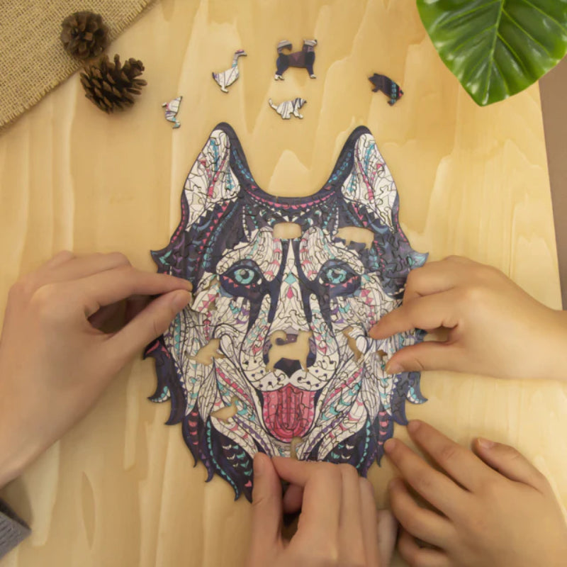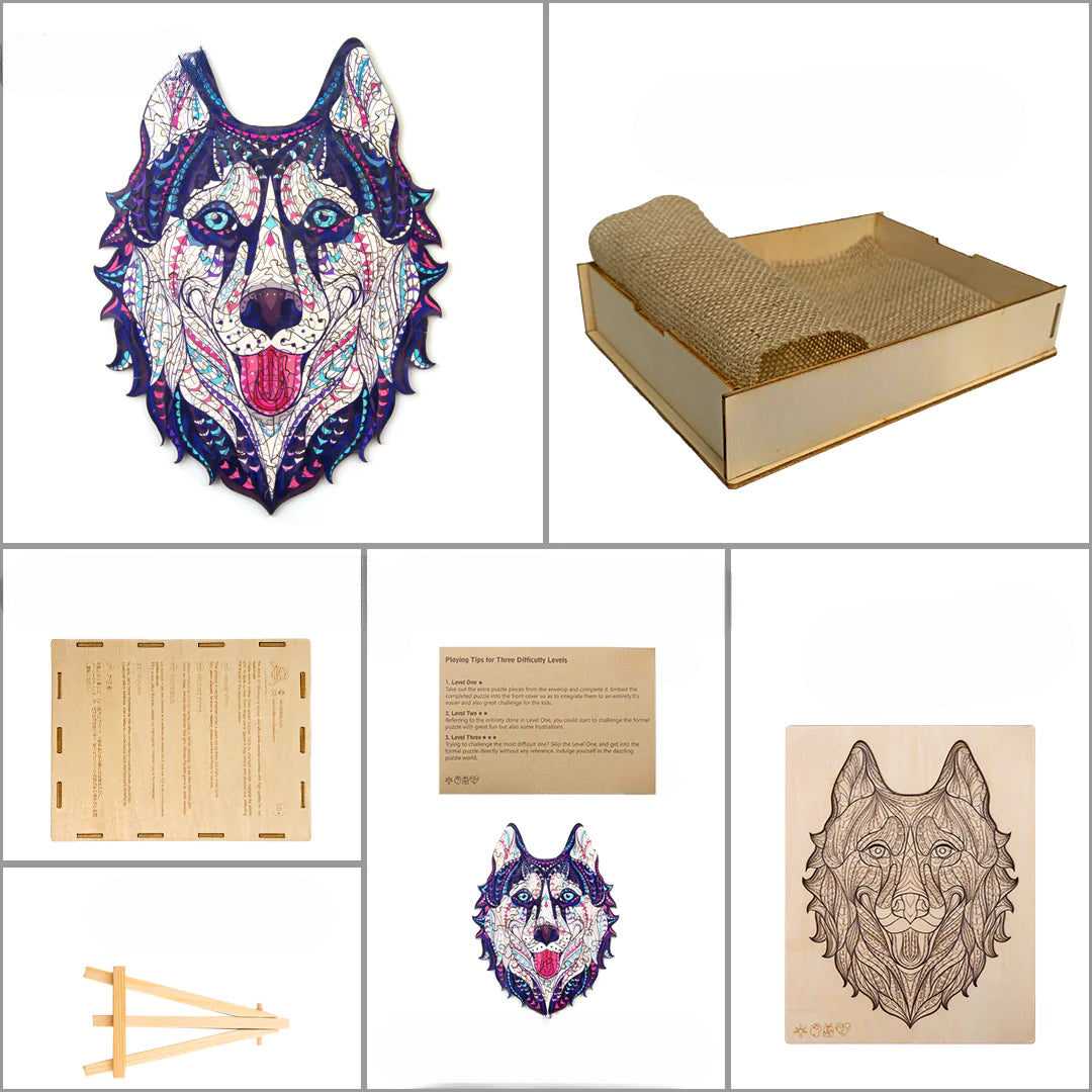 A Work of Art and Canine Majesty: The "Husky Wooden Jigsaw Puzzle" is not just a puzzle; it's a tribute to the majestic Siberian Husky. Once completed, it transforms into a stunning piece of art that can be proudly displayed or shared with fellow Husky enthusiasts. Embark on a puzzle adventure filled with the beauty and resilience of these remarkable dogs as you assemble your own Husky masterpiece.