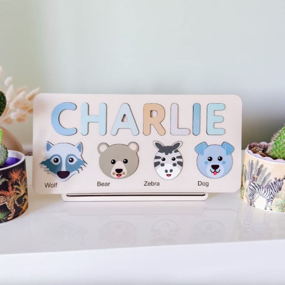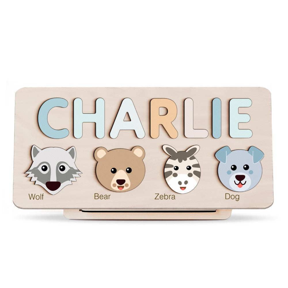 Pieces: Includes four animal puzzle pieces, featuring a wolf, bear, zebra, and dog, crafted for ease of fitting.