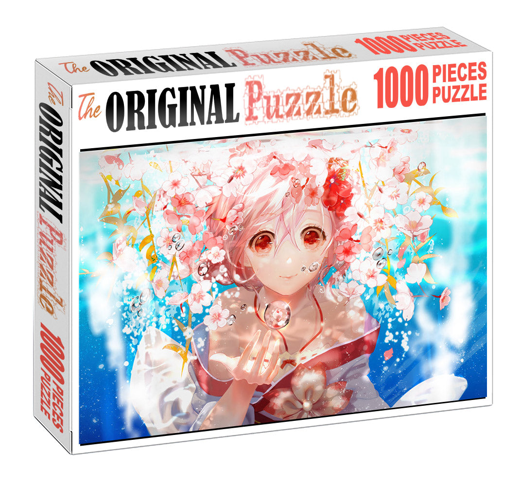 Krystal of Eyes 1000 piece wooden jigsaw puzzle is a cartoon image of this anime girl with crystal eyes surrounded by bubbles and flowers.