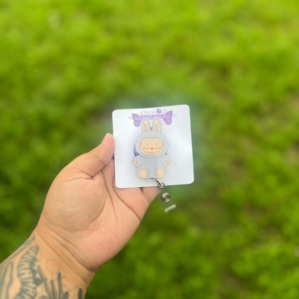 The central figure of the badge reel is made from printed acrylic, featuring Labubu in a vivid design. Each piece is carefully shaped and printed to maintain clean edges and clear surface detailing.