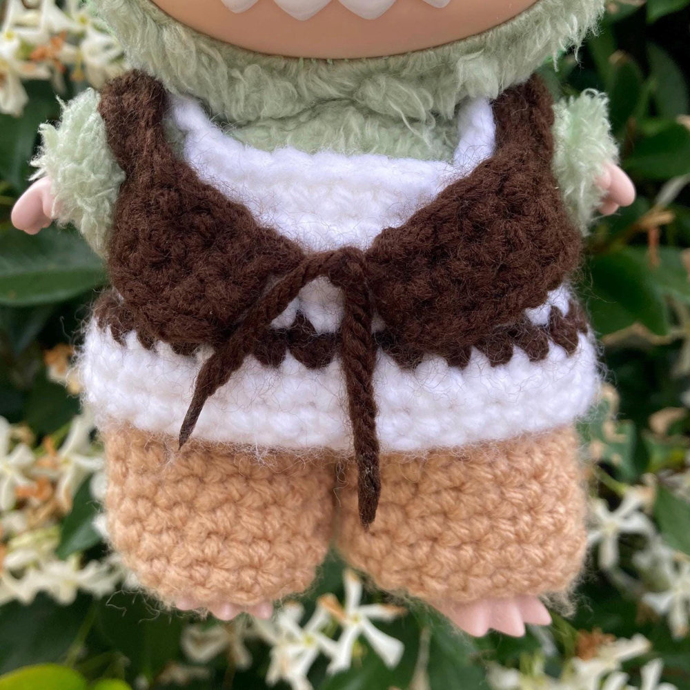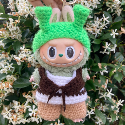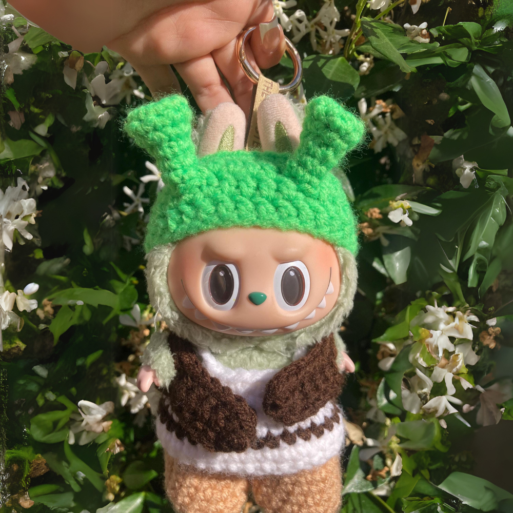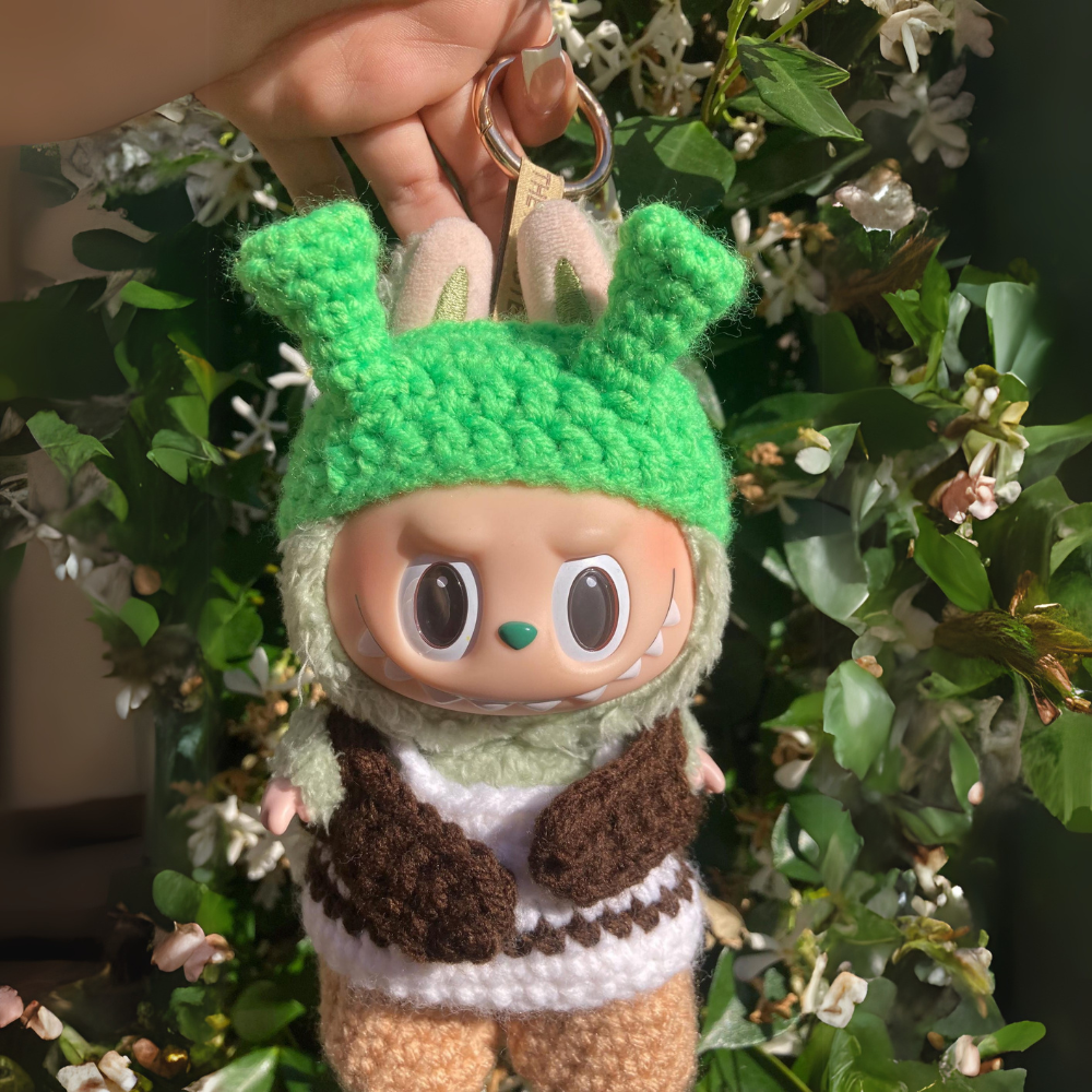 Labubu Plush Outfit: The plush wears a outfit made from crocheted thread. The horned hood adds character to its display look.