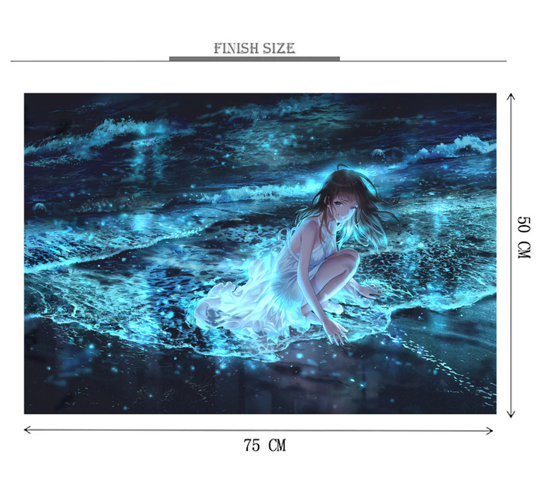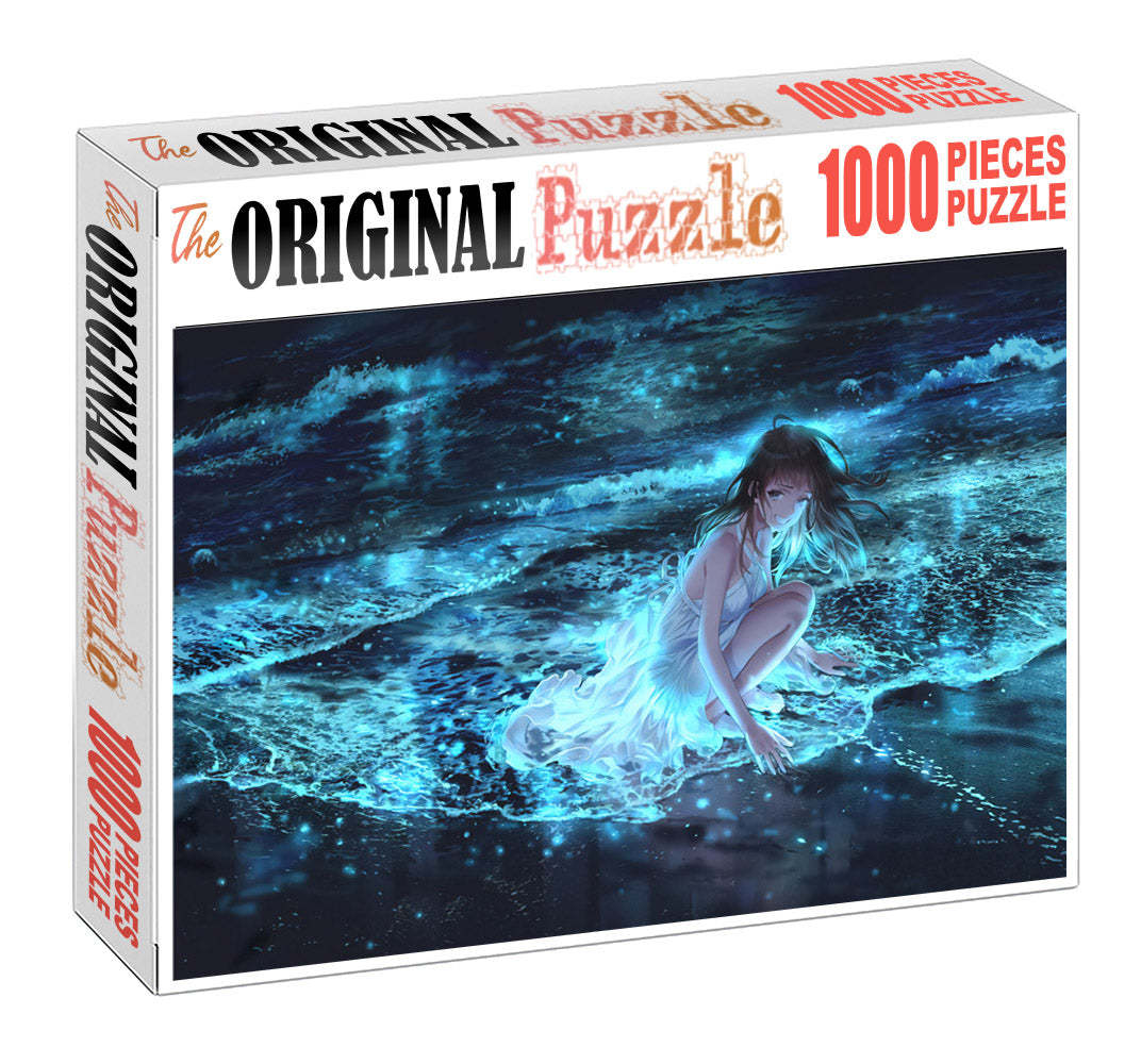 Lady of Ocean 1000 piece wooden jigsaw puzzle is an illustration of a lady sitting at the edge of the ocean.