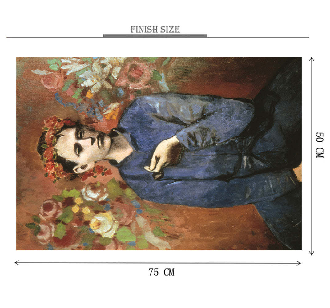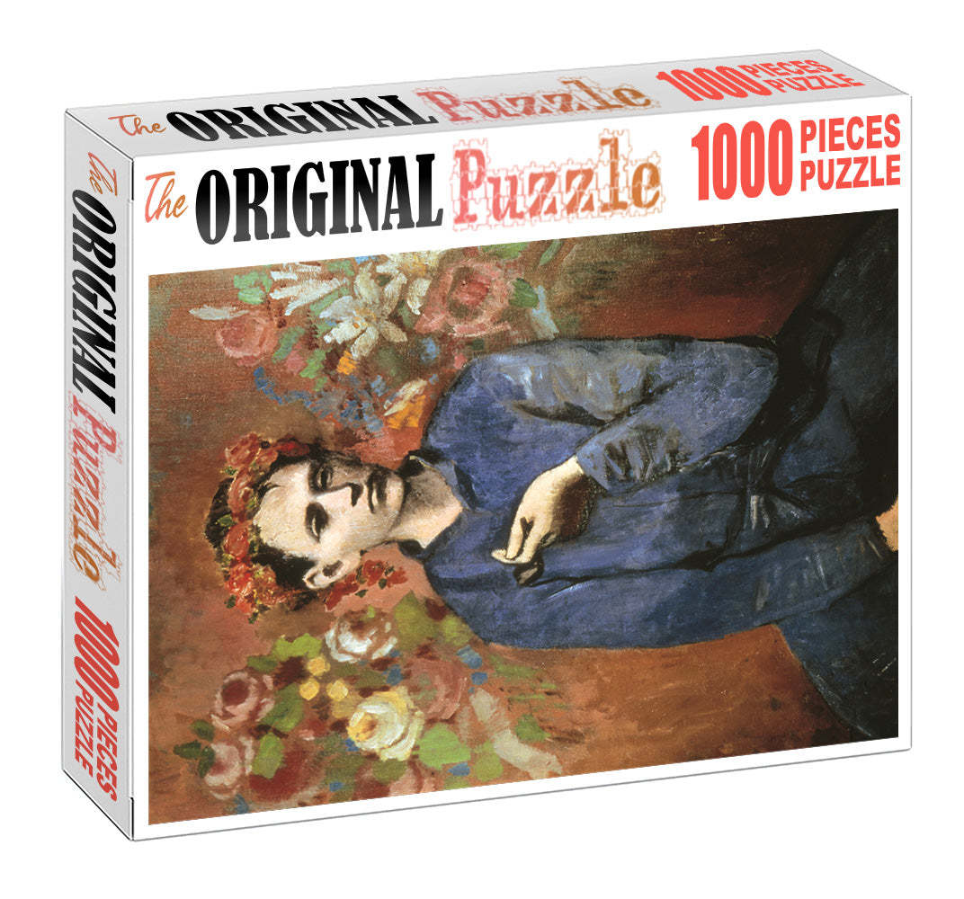 Lady with the Flower Crown 1000 piece wooden jigsaw puzzle is an illustration of a lady in a blue dress wearing a flower crown on her head.