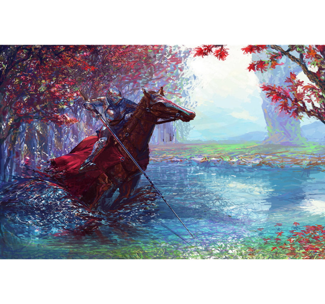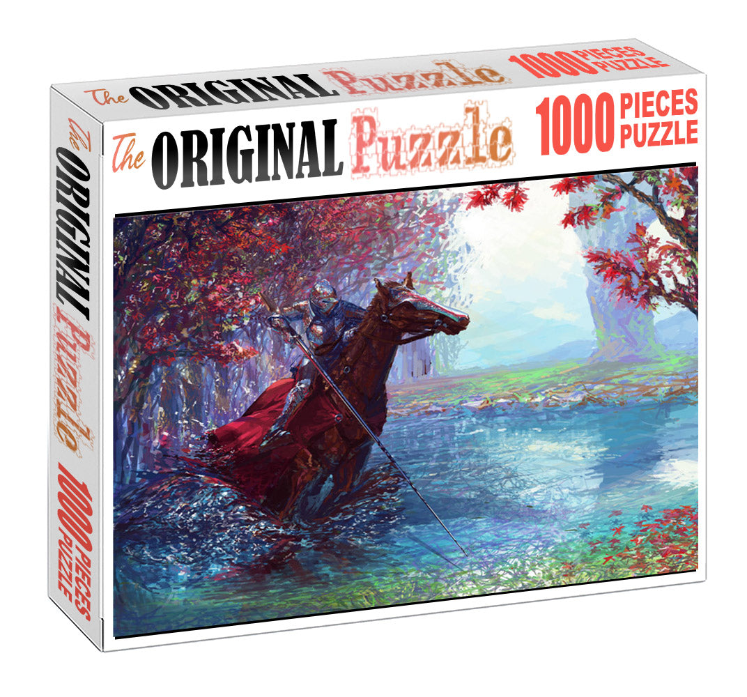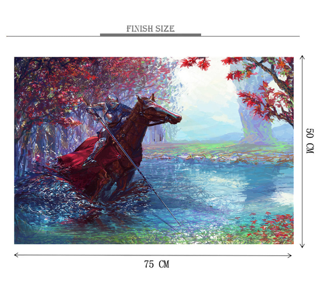 Last Knight 1000 piece wooden jigsaw puzzle is an illustration of a knight on his horse, riding through an autumn meadow.