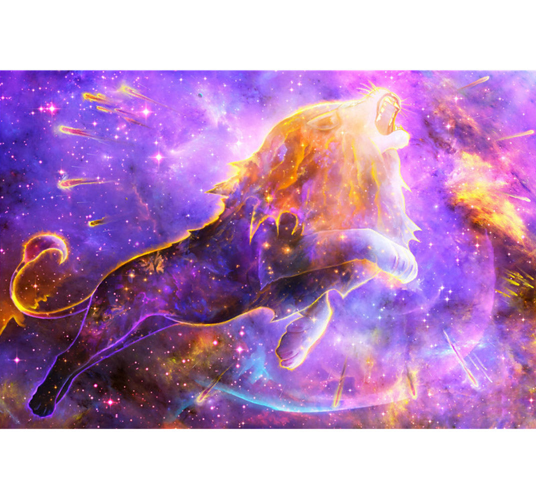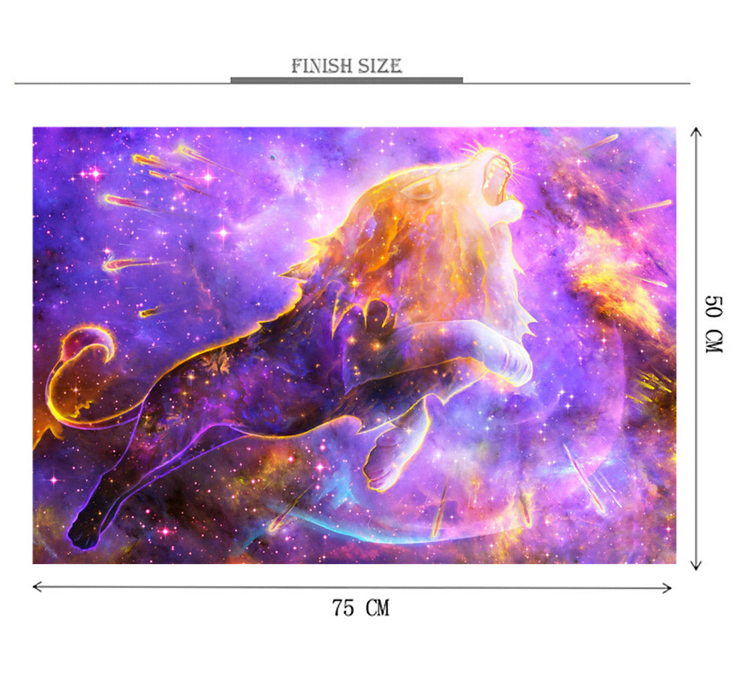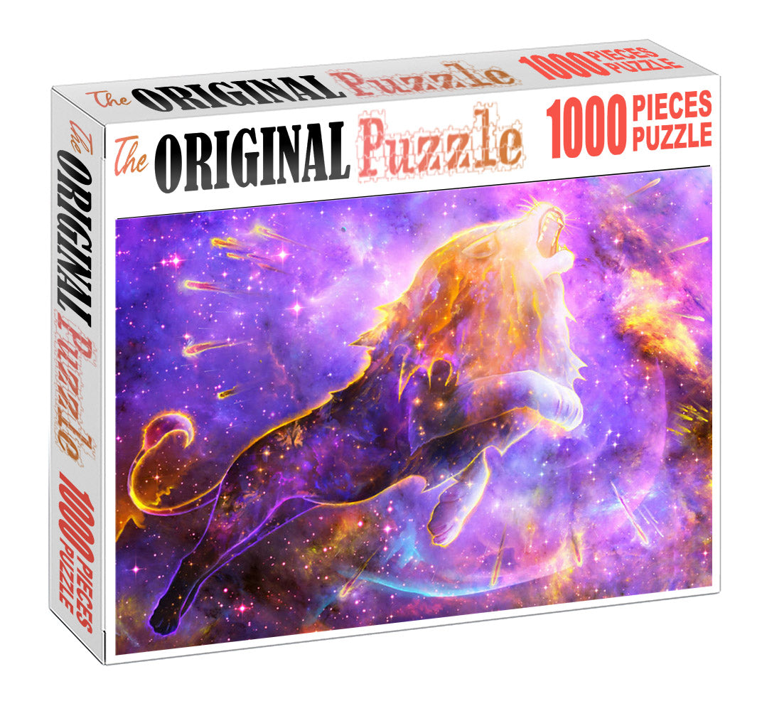 Leo 1000 piece wooden jigsaw puzzle is an illustration of a bold lion gliding through a futuristic background.