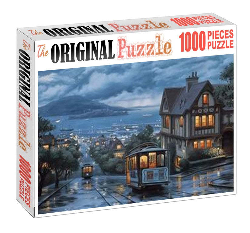 Local City Train Wooden 1000 Piece Jigsaw Puzzle is an illustration the showcases the local trains on the city rolling through a the settled rain.