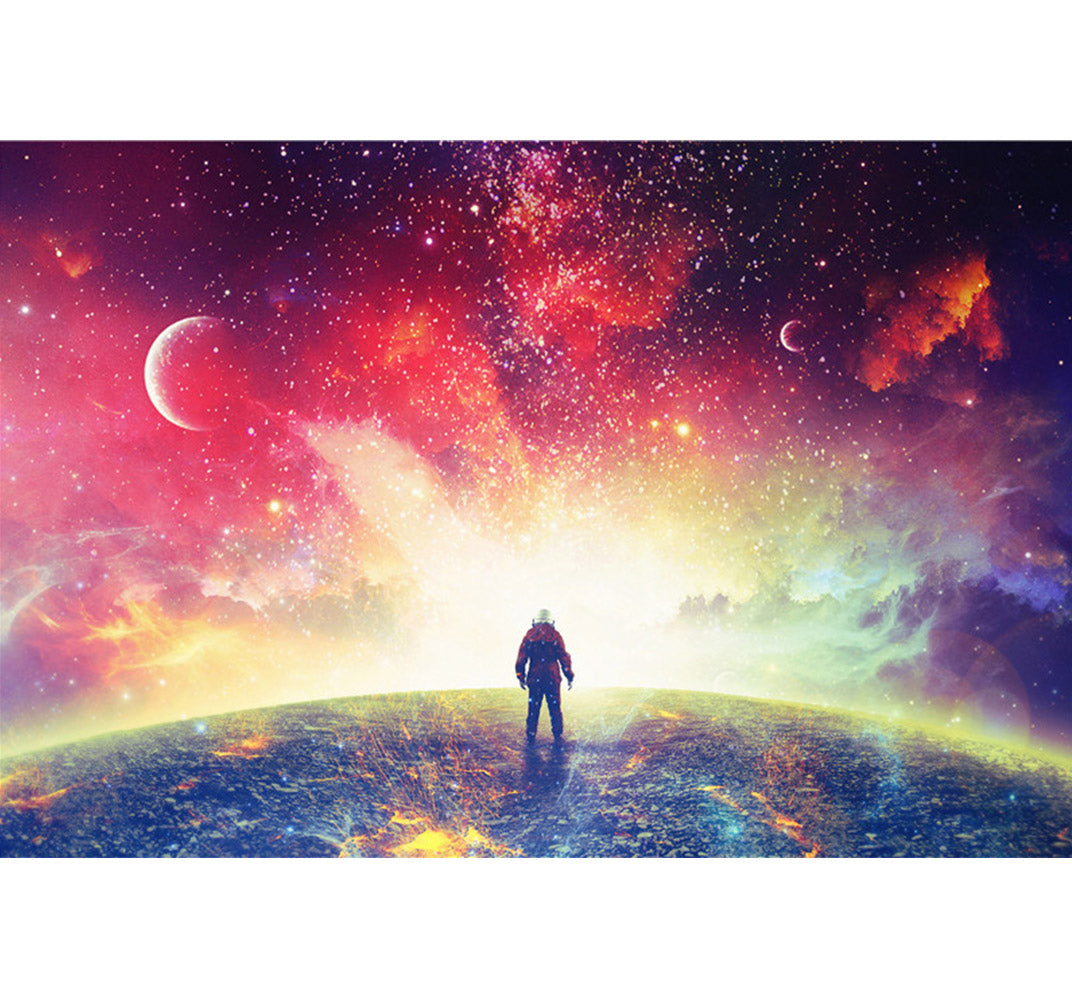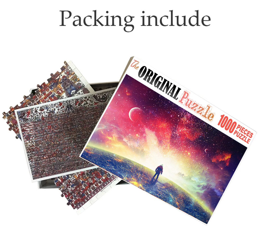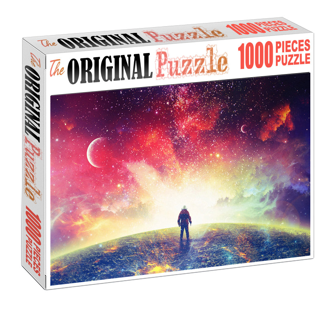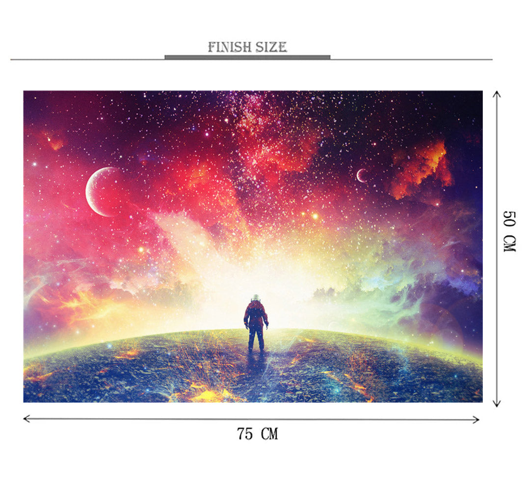 Lost in Space Wooden 1000 Piece Jigsaw Puzzle is a futuristic image of an astronaut standing on top of the earth looking out into a colorful galaxy.