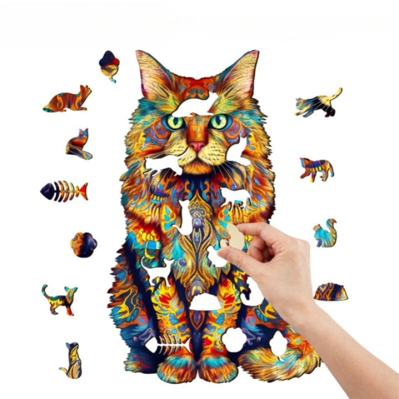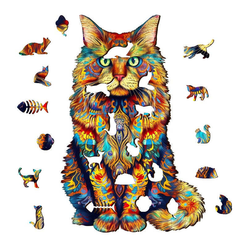 Pattern & Texture: The puzzle pieces boast a smooth, glossy finish, enhancing the tactile experience while piecing together the image of the Maine Coon cat.