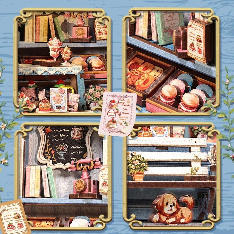 Each piece is precision laser-cut to ensure accuracy, offering an enjoyable and creative assembly experience. The result is a beautifully detailed model that showcases pastries, candies, and storefront elements within an ornate blue façade. When illuminated, the LED lighting brings warmth and dimension, transforming it into a captivating bookshelf insert or decorative art piece.