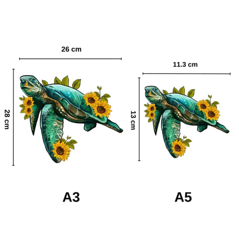 The Turtle Wooden Jigsaw Puzzle is a harmonious combination of artistic design and engaging craftsmanship. Featuring a illustrated turtle surrounded by delicate sunflower accents, this puzzle brings the beauty of nature and marine life to your hands. Designed for enthusiasts who enjoy a challenging puzzle or an elegant decor item, this piece blends functionality and aesthetic appeal.