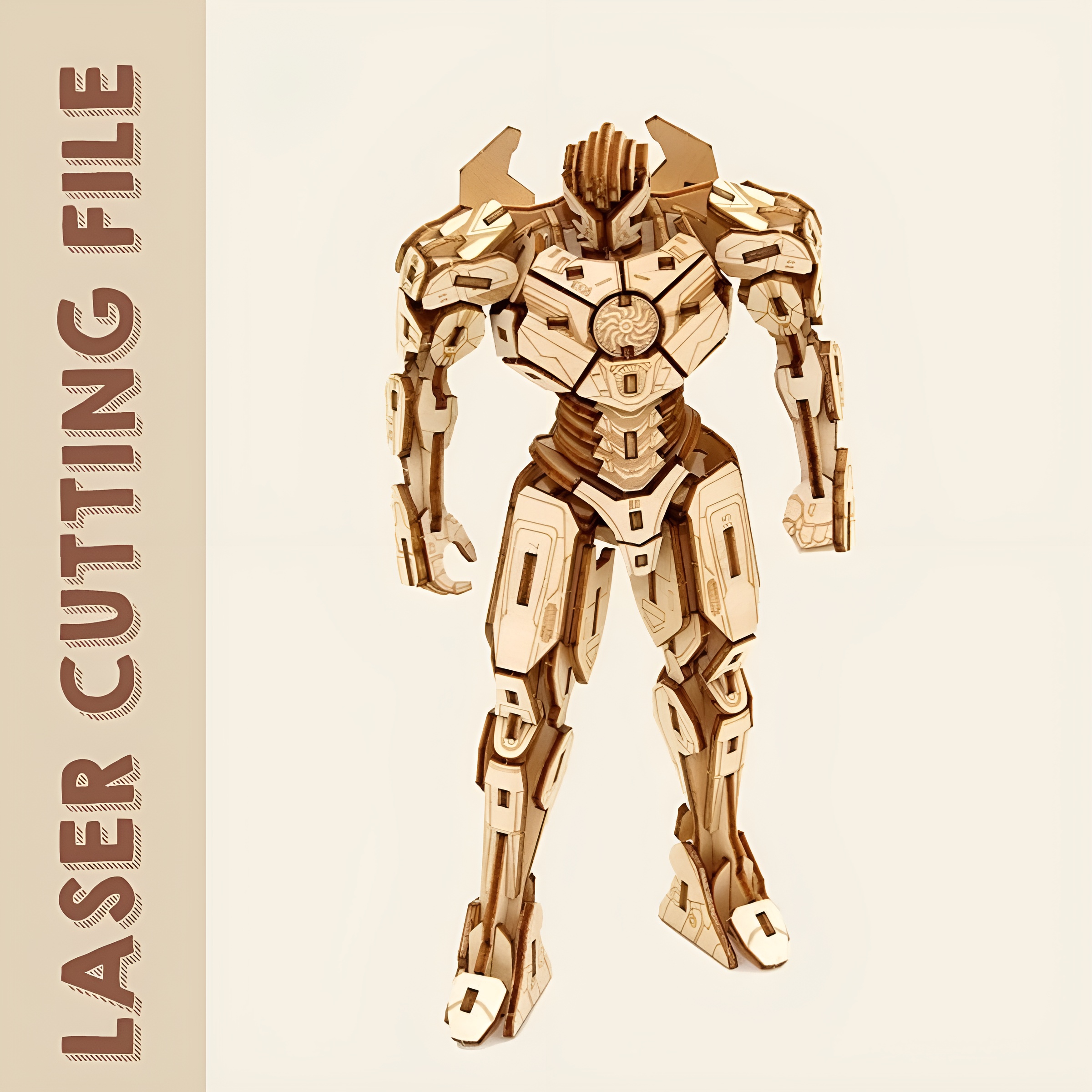 This digital template allows makers to convert flat wooden sheets into a dimensional mechanical warrior model. It serves as both a creative build and a display piece suitable for studios, maker environments, and collectors of mechanical themed decor.
